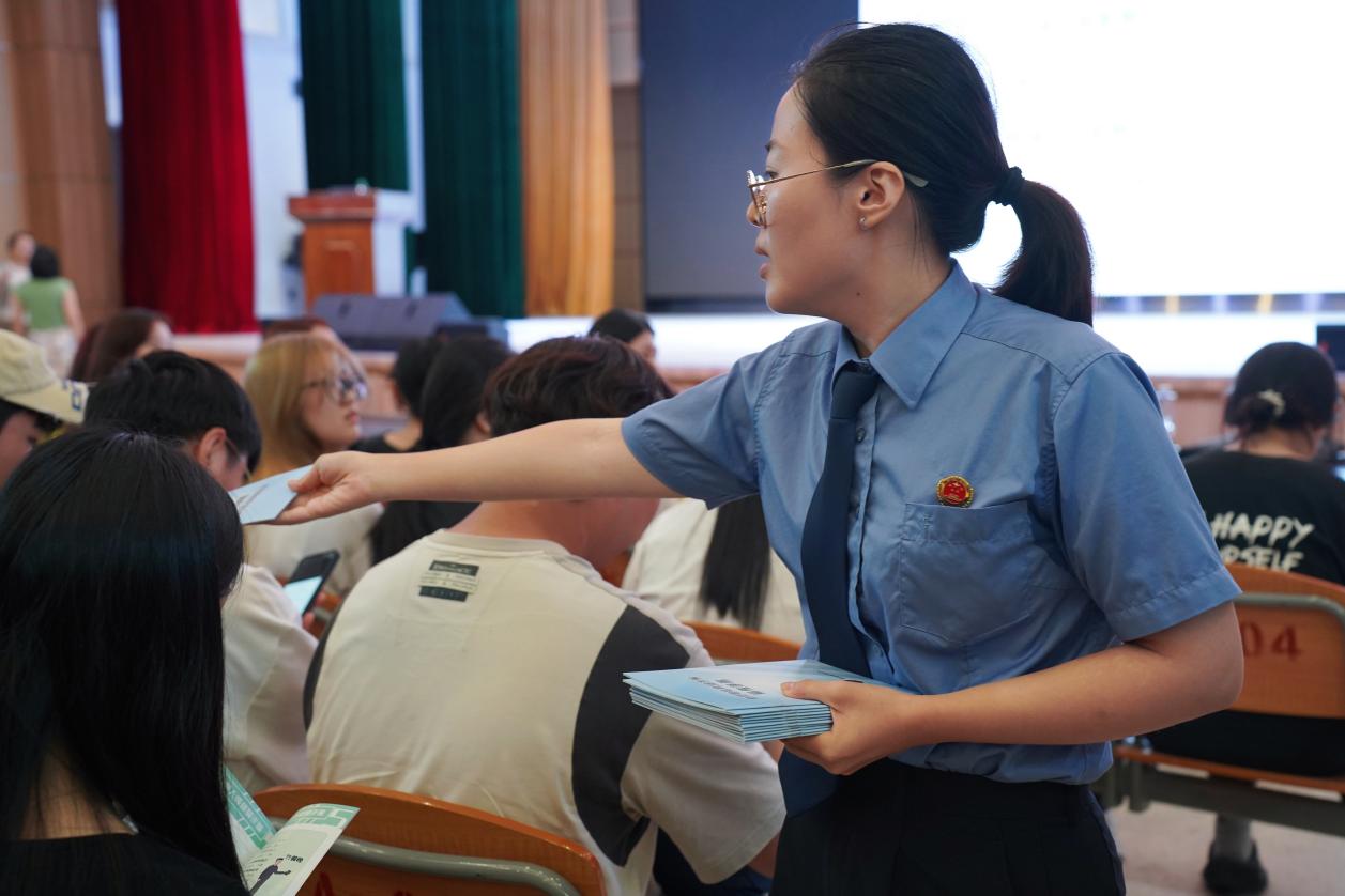 讲座还重点传授防范电信网络诈骗、拒做诈骗“工具人”的方法,并提醒学生牢记犯罪前科对升学、考公、征信的深远影响。讲座结束后,施薇向现场师生发放法治宣传单,持续强化安全提醒。