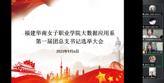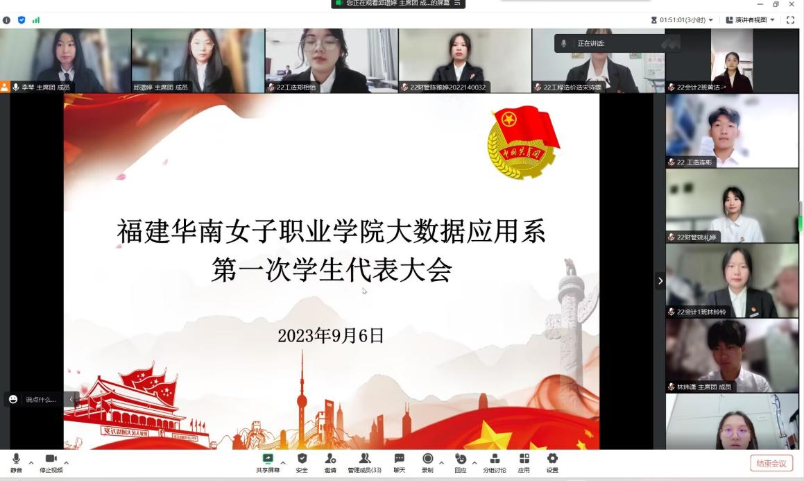 为进一步提高我系学生工作质量,提升学生自我管理、自我服务意识,2023年9月6日12:30,大数据应用系于线上召开第一次团员代表大会暨第一次学生代表大会,党总支书记罗莹燕老师、各辅导员及各班学生干部代表参加本次活动。