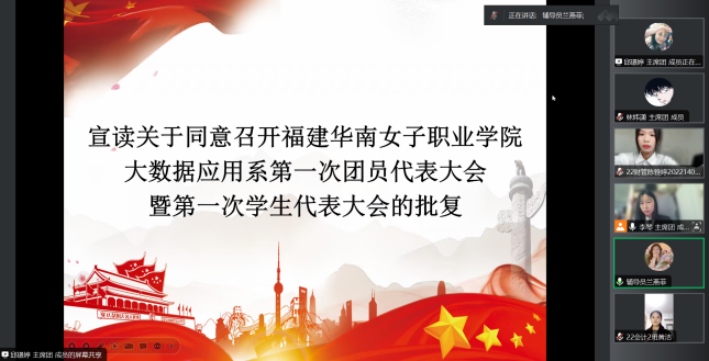 在兰燕菲老师宣读《关于同意召开福建华南女子职业学院大数据应用系第一次团员代表大会暨第一次学生代表大会的批复》后,团总支书记及各学生干部候选人回顾了自己一年来参与的工作和活动,分享自己的成长与收获,在面对评委的提问时也从容不迫,对大数据应用系团总支的未来规划畅所欲言,表达了各自的想法。最后,全体师生齐唱团歌,将大会落下了帷幕。