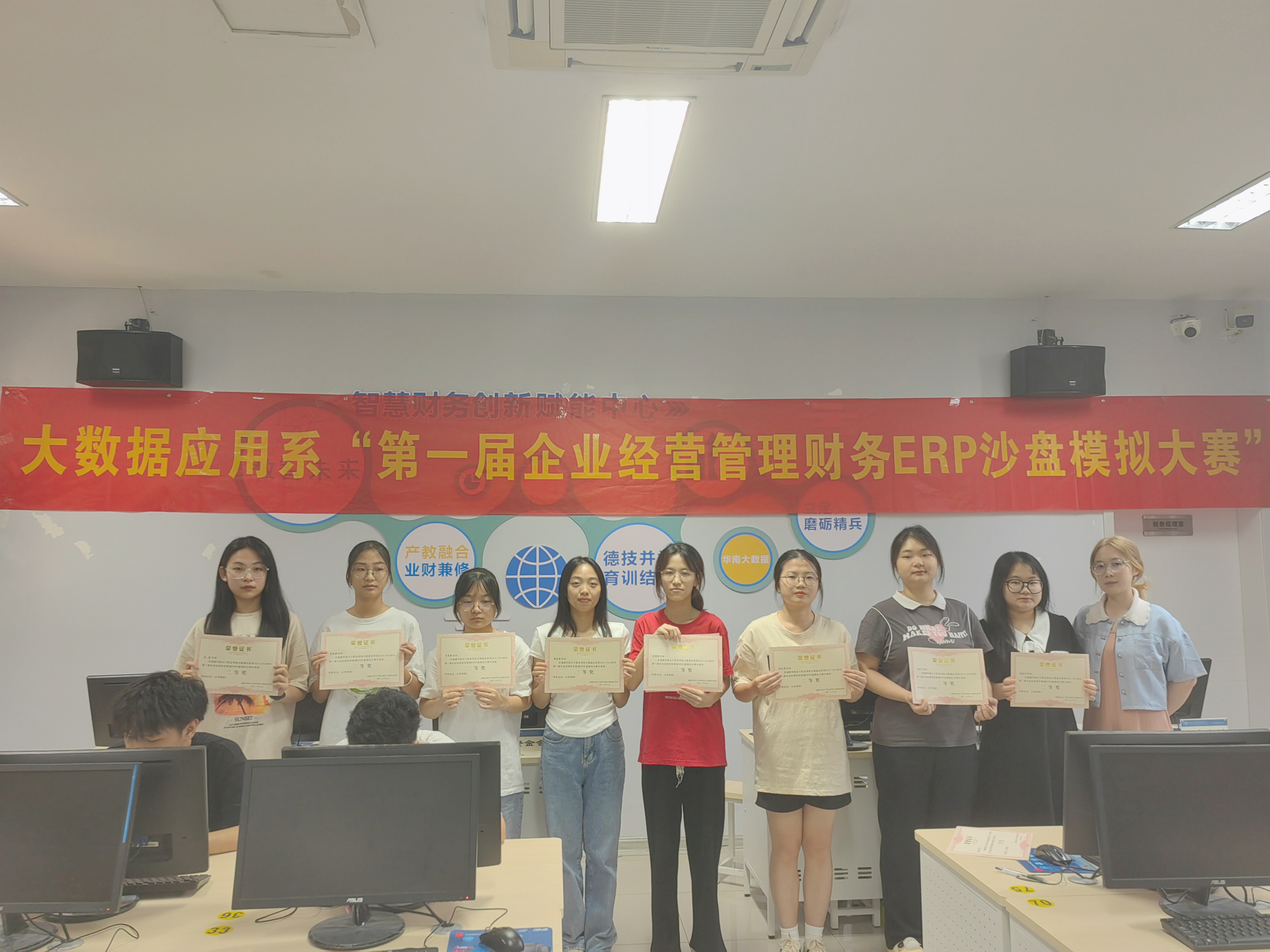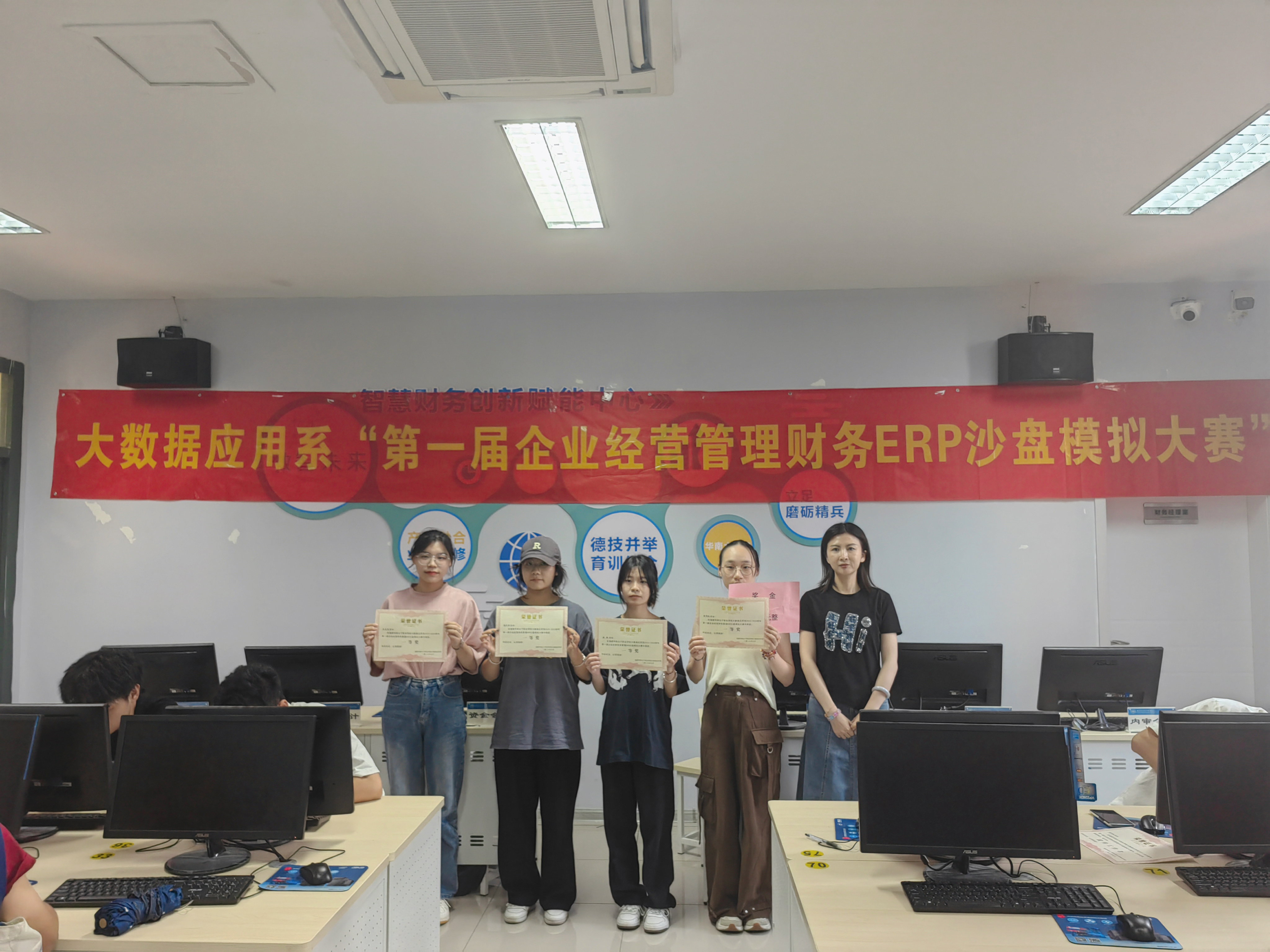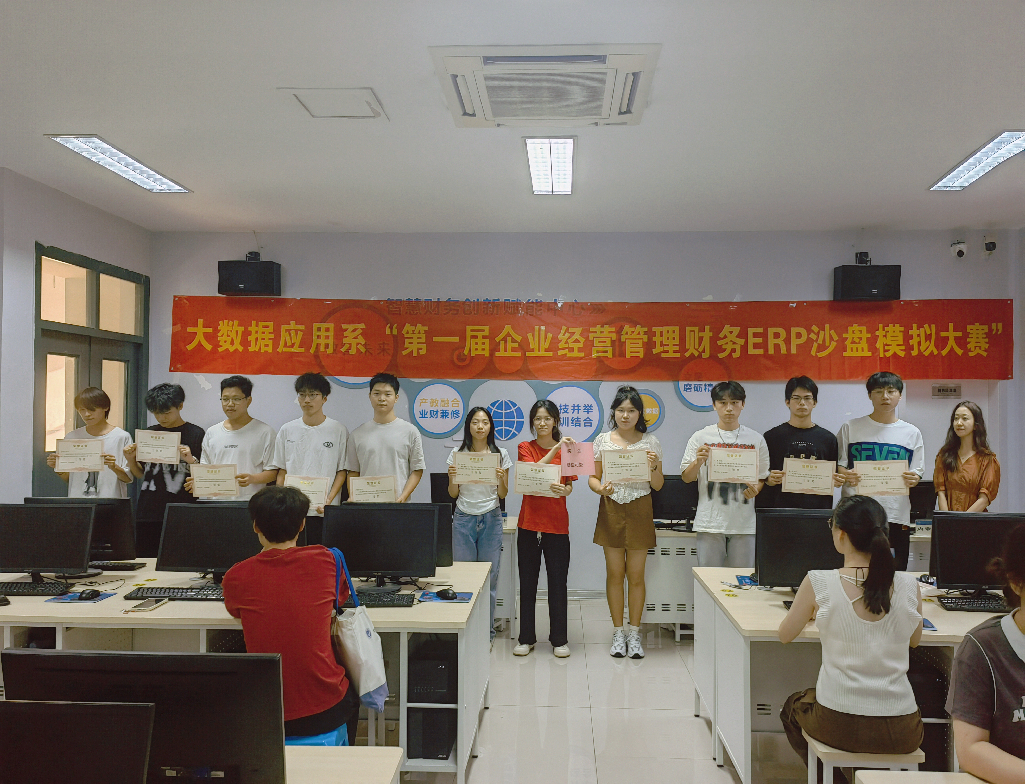 为进一步推进我校实践教育内涵建设,培养学生创业意识,强化学生创新精神和实践能力,提高学生的创新创业实践水平,913,大数据应用系主办大数据与会计、大数据与财务管理专业承办的“第一届企业经营管理财务ERP沙盘模拟大赛”在实训2-406举办。经过一天的激烈比拼大赛圆满落下帷幕