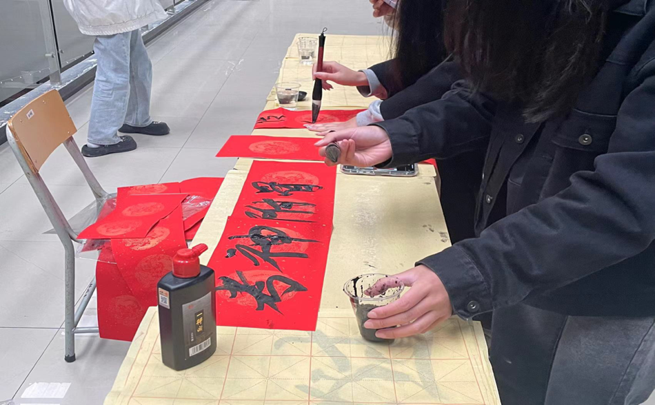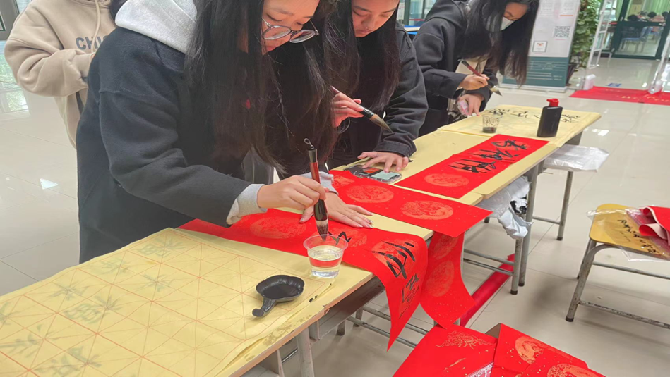 阵阵墨香指尖流,悠悠韵味心脾沁。活动现场,春联纸、毛笔和砚台被整齐地摆放在桌子上,鲜红的纸张渲染着浓浓的节日氛围,一笔一墨,一竖一横,一撇一捺,一幅幅写满新年祝福的春联和“福”字。写的是汉字,报的是节讯,暖的是人心,大数据应用系的同学们于黑墨红纸间感受着笔墨丹青的独特魅力,浸润中华优秀传统文化的韵味中,续写着饱含真情的美好祝愿。