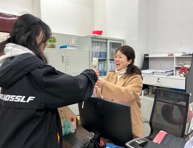 节日当天,同学们将亲手制作的花束送到每位女老师的手中,并对老师们送出诚挚的祝福“节日快乐”。对于这份突如其来的惊喜,老师们脸上洋溢着幸福的笑容,并对同学们的礼物表示感谢。