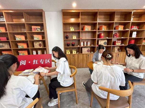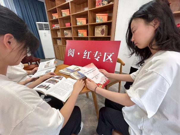 实践队成员来到百丈村“阅红专区”,展柜中的书籍清楚详细地介绍了近几年百丈村的深刻变革,曾经在村民眼中的百丈村是“白色”的——石材成堆;但近年来,百丈村坚持规划引领发展,全面推进美丽乡村和“绿盈乡村”工作建设,村容村貌焕然一新,村民们从吃“石材饭”到吃“文旅饭”。