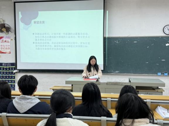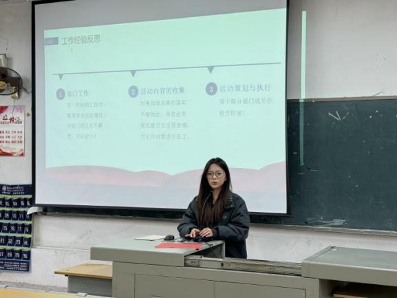 随后,团总支学生会各部门部长从部门介绍、工作展示、工作计划、部门特点等方面对过去一个学期进行总结,也说出对于未来的展望。并表示会加强与部员之间的联系与合作,做好部门工作的改进和创新。