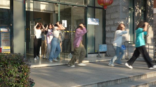 10月14日下午16:00,地震警报骤然响起,学生按指令护住头部,弯腰有序撤离。整个演练过程组织有序,撤离迅速,紧张而不慌乱。
