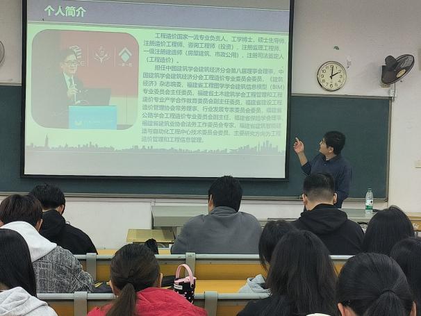 此外,福建理工大学李杰教授应邀带来的“工程造价专业与行业发展趋势” 专题讲座,成为学生接触行业前沿的重要窗口。李杰教授以深厚的学术功底和丰富的行业经验,系统剖析了工程造价咨询行业的发展现状,精准研判未来趋势,重点阐述了大数据、人工智能等新一代信息技术与行业深度融合的价值。学生纷纷表示讲座拓宽了专业视野,明晰了技术赋能下的职业发展路径,收获颇丰。