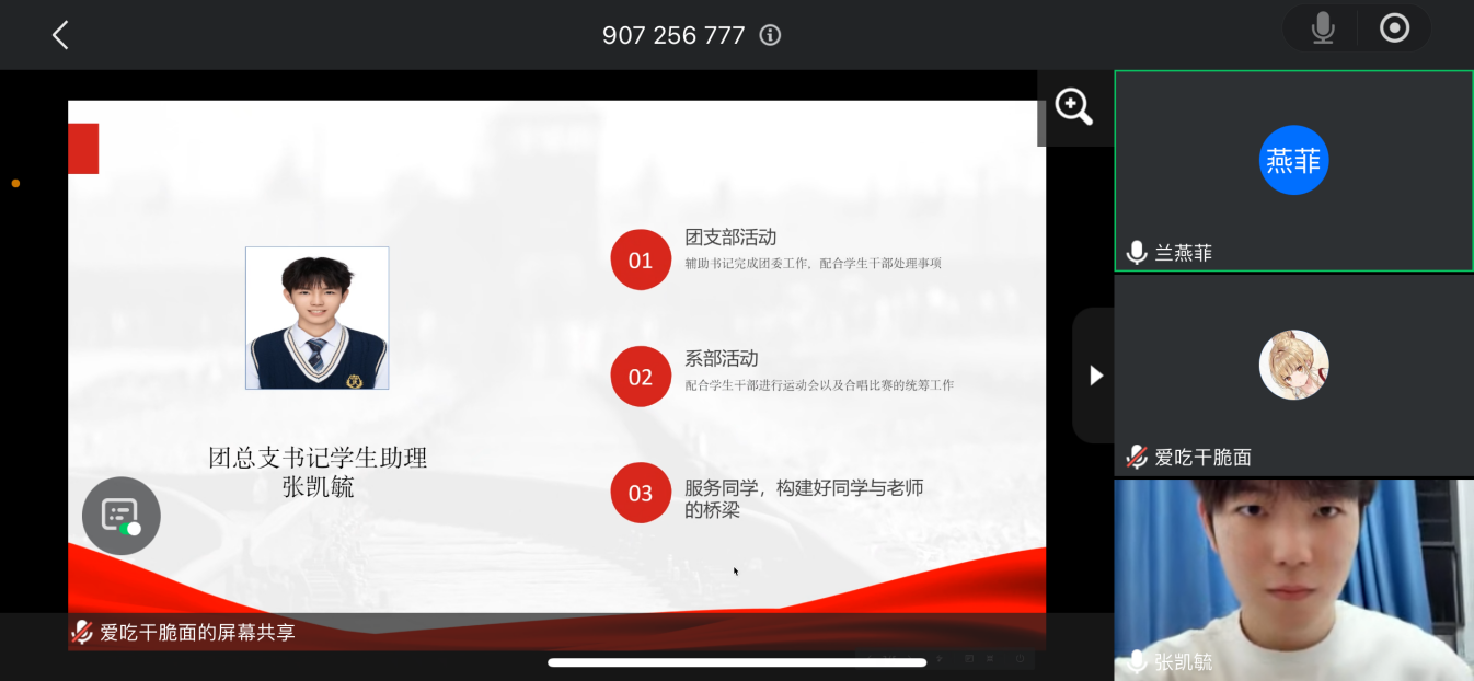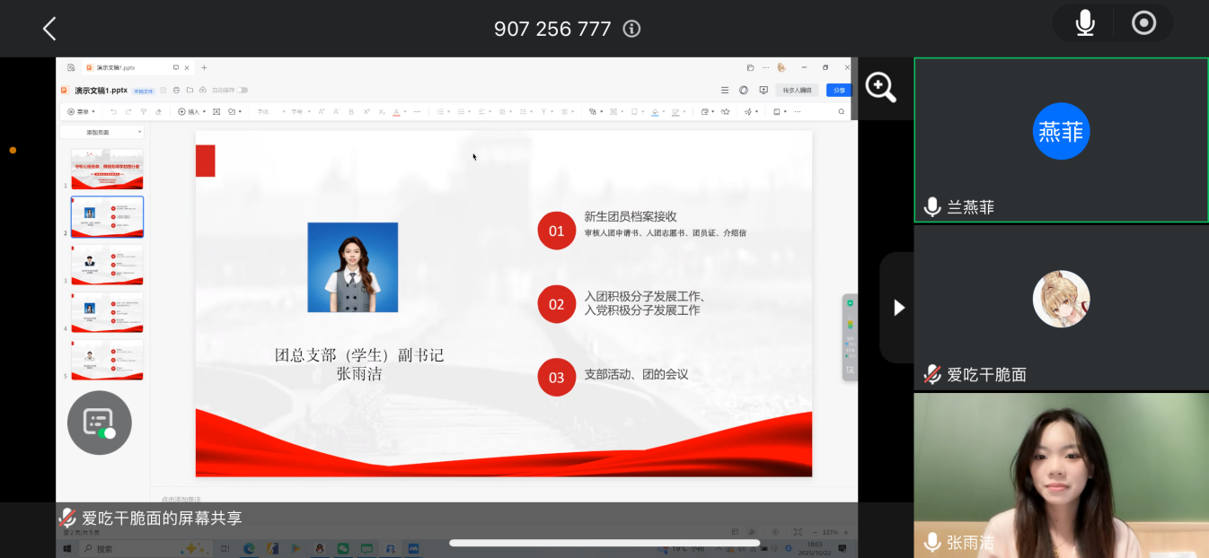 为进一步加强大数据应用系学生干部队伍建设,总结2024-2025学年学生工作以及各部门交接工作完成情况汇报,7月23日晚,大数据应用系团总支举行线上学生干部述职大会,团总支书记兰燕菲以及全体学生干部参加。