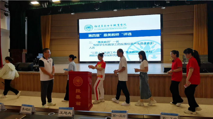 第七届“三育人”先进工作者评选环节,与会代表认真观看候选人先进事迹介绍,并投下庄严的一票。经过公正、公开的评选,姜丽梅、黄雅璐、刘雅培、张敏、程如秀、许碧瑜六位老师荣获第七届“三育人”先进工作者称号。随后,进行了第四届“最美教师”的评选。经过教职工投票评选,结合前期学生在学校官微及“易班”的网络票选结果,刘雅培老师当选第四届“最美教师”。