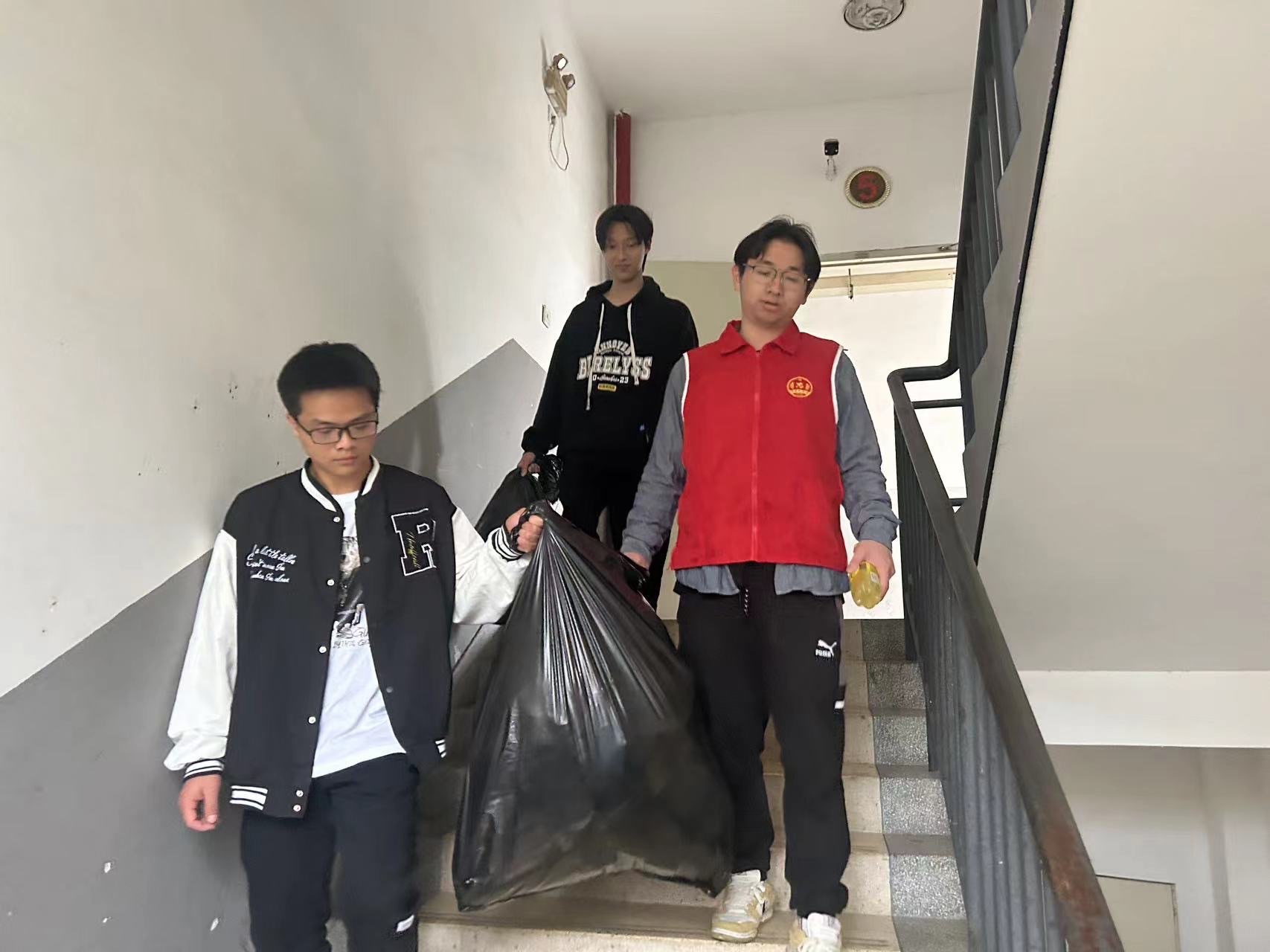 师生党团员志愿者热情上门提醒同学们要保持宿舍卫生,不使用高功率电器,并对长期在门口堆放垃圾较多的宿舍进行文明劝导,帮助清理,积极倡导同学们避免在门口堆放垃圾占用消防通道,引导同学们树立宿舍文明形象,保持宿舍卫生,争创文明宿舍。