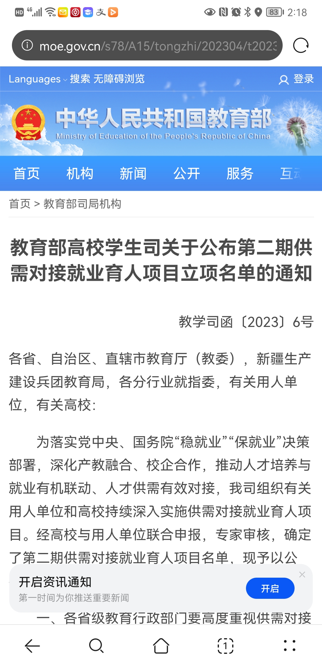 供需对接就业育人项目是2021年12月由教育部高校学生司发起的,为落实党中央、国务院“稳就业”“保就业”决策部署,深化产教融合、校企合作,推动人才培养与就业有机联动、人才供需有效对接而组织的有关用人单位和高校实施的提升就业、服务育人的校企合作项目。