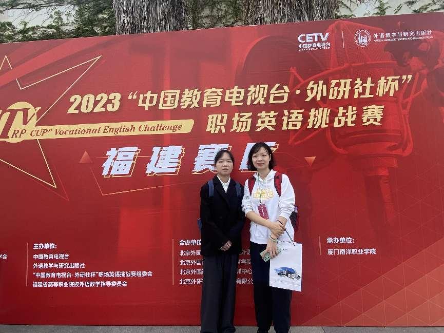 2023年10月22日,2023年“中国教育电视台·外研社杯”职场英语挑战赛福建赛区决赛在厦门南洋职业学院拉开序幕,国际商务管理系教师吴瑗瑗、林翠翠作为指导老师,带领2021级商务英语专业学生吴林静、2022级国际经济与贸易专业学生王星烁参加比赛。