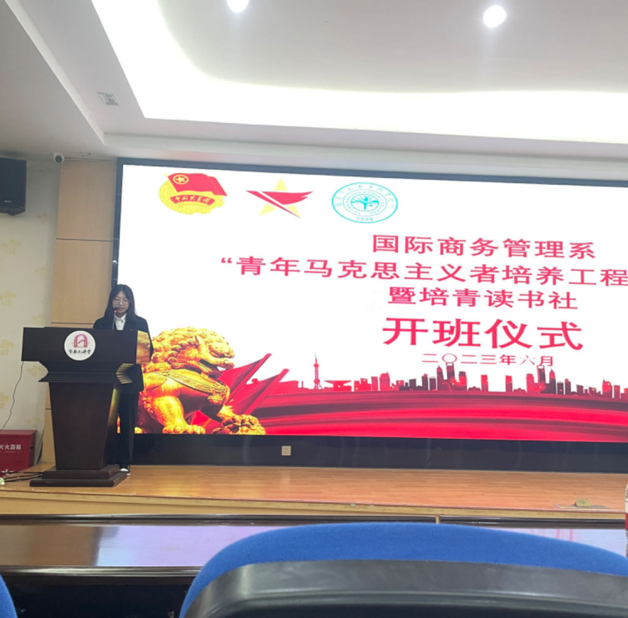 青年一代有本领、有担当,国家就有前途,民族就有希望。为深入学习贯彻党的二十大精神和习近平总书记关于青年工作的重要思想,2023年6月12日,国际商务管理系在余宝笙学术报告厅举行”青年马克思主义者培养工程”培训班暨培青读书社开班仪式。国际商务管理系团总支书记罗莹燕、学生党支部书记李永忠、辅导员方佳慧出席本次开班仪式、“青马工程”培训班学员及全体“培青”读书社成员共同参会,系学生会主席团成员高伟燕主持会议。