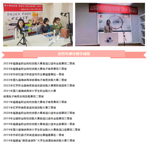 商务英语专业围绕福建省高质量发展的总体目标,主动适应现代化体系建设发展,专业采用“外语+专业+技能”的叠加式教育体系,培养学生掌握良好的外语水平,较扎实的国际电子商务理论基础,有较强的市场经济意识、社会适应能力和国际电子商务创业能力,能够胜任国际电子商务、涉外金融及外(合) 资或其他领域涉外经济工作岗位的复合型技术技能人才。近五年来,专业人才培养成果突出,多次荣获福建省职业院校技能大赛一、二、三等奖,全国职业院校技能大赛三等奖。专业师资力量雄厚,拥有一支业务水平高、结构层次合理的专兼教师队伍。为保证国际化人才培养的特色,专业常年安排教学经验丰富、责任感强的高学历外籍教师与海归硕士担任英语类实践课程的教学任务,如英语口语、英语阅读、公共英语演讲艺术、国际商务交际等课程。