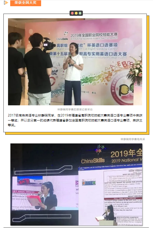 2017级商务英语专业林静娴同学,在2019年福建省高职院校技能大赛英语口语专业赛项中荣获一等奖;并以总分第一的成绩代表福建省参加全国高职院校技能大赛英语口语专业赛项,荣获三等奖。
