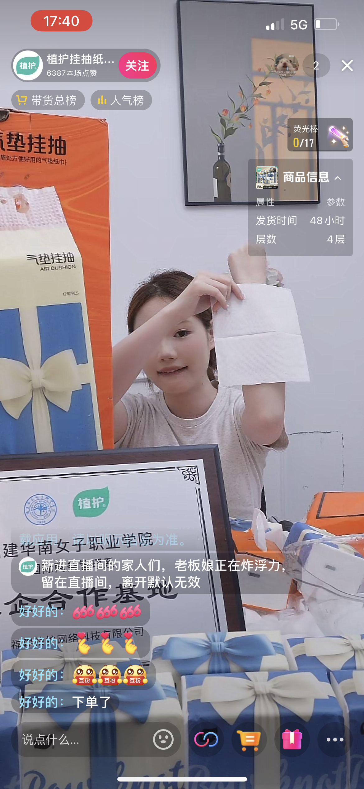 宝宝们,这是我们家经典的蝴蝶结系列,有挂抽和抽纸2种,挂抽6提29.9元送4个挂钩,1提320抽1280张哈,原生木浆,亲肤不掉纸屑,鼻子不舒服的宝宝也可以用,在1号链接可以拍下。抽纸一箱20包,也是29.9元,在2号链接,性价比非常高,主播建议宝宝们一起带,一起包邮到家。