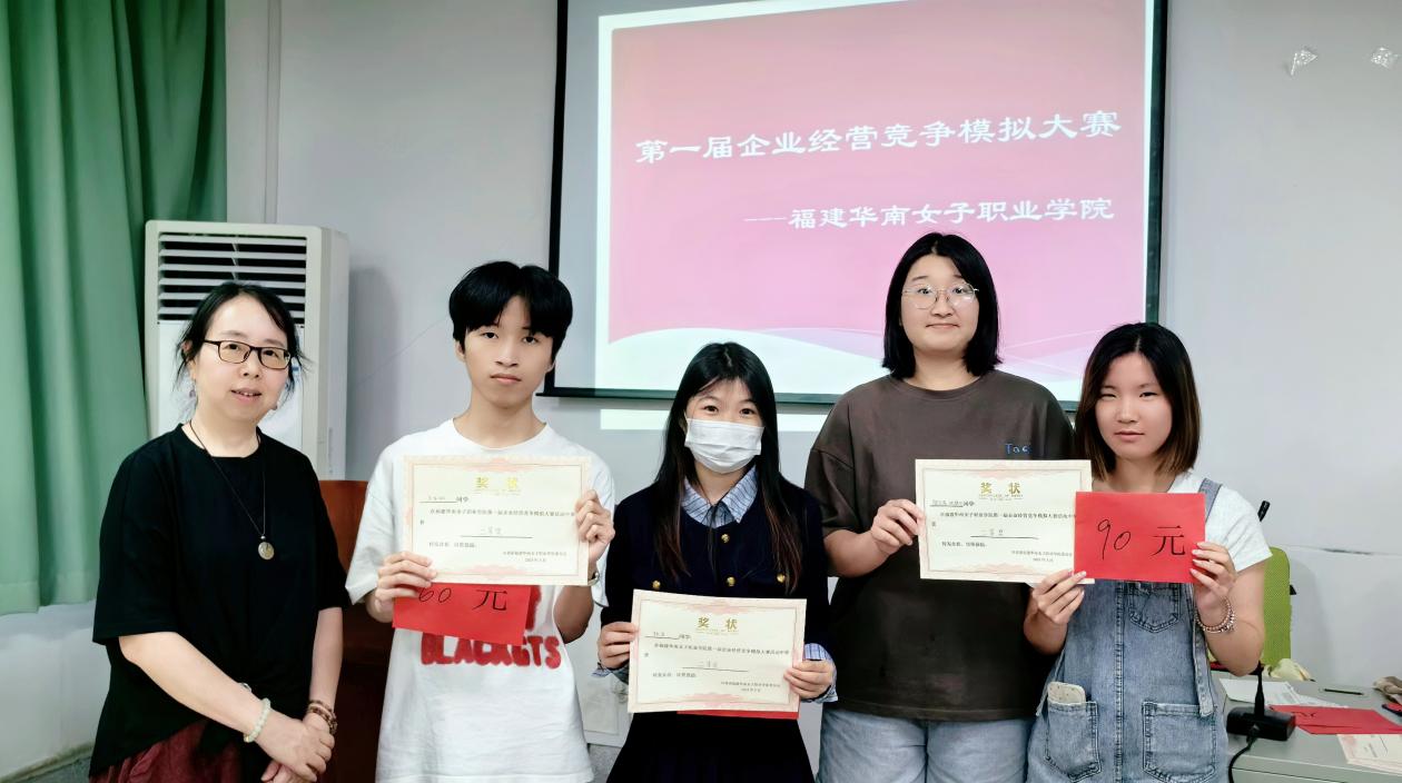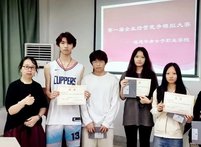 一等奖:22级跨境电子商务专业黄泽俊(左二),23级电子商务专业庄滢(中间),22级国际经济与贸易专业黄添松(右二),2022级国际经济与贸易肖燕平(右一)。