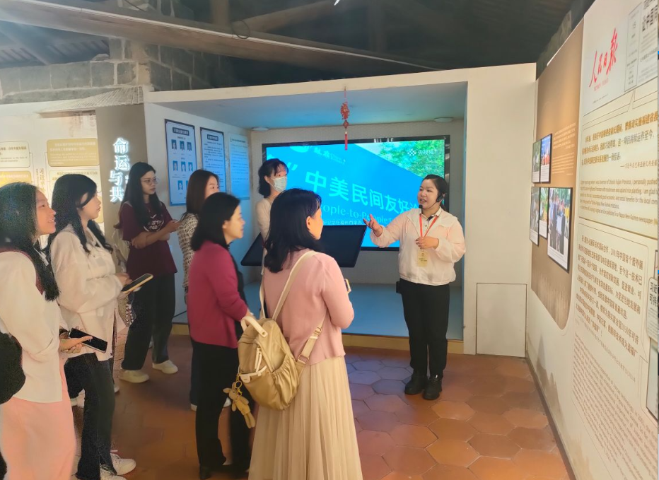 鼓岭万国公益社曾经是鼓岭上外国友人的社交娱乐空间,这是百年前鼓岭最热闹的地方。如今万国公益社被提升改造为“鼓岭故事”——习近平同志领导福州对外交流的创新理念和生动实践主题展示馆,展馆分为五个部分,包括国际社区、鼓岭故事、友好福州、开放福建和命运与共。在这里师生共同观看鼓岭上外国友人与当地百姓的趣味故事、与福州的故事,更深入的感受到福州的对外开放,更加真切的体会到人类命运共同体的意义,同学们认真听着讲解一边拍照记录,更希望能够将这里的人文精神和中外友好故事记在心里,传承下去。
