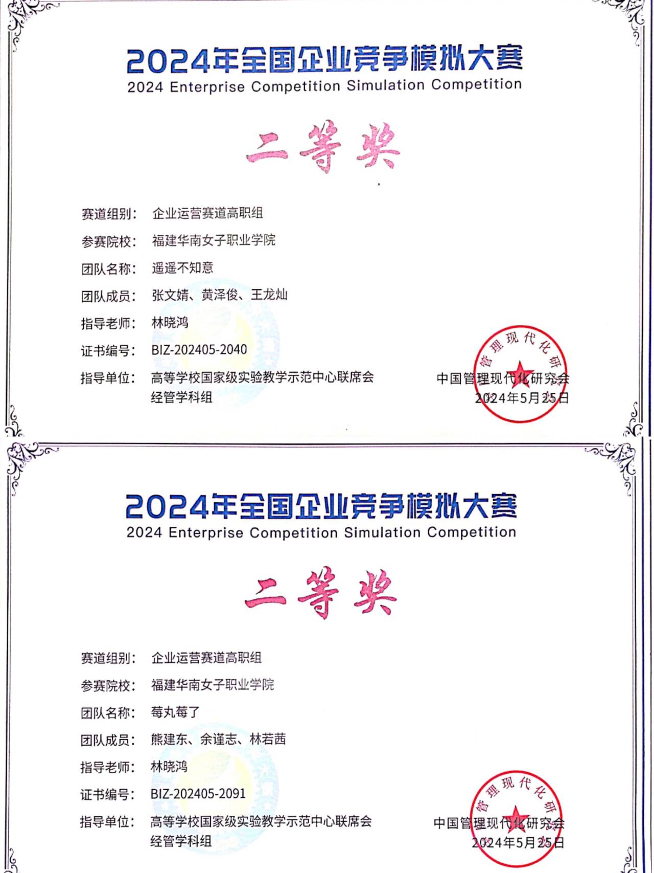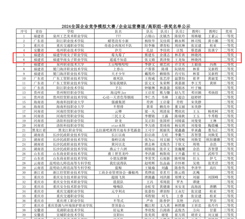 2024年全国企业竞争模拟大赛于2024年4月启动,6月落下帷幕。由我院国际商务管理系林晓鸿老师指导的学生代表队“遥遥不知意”、“莓丸莓了”经过初赛、复赛、全国半决赛的激烈竞争,脱颖而出,成功斩获两项高职专科组全国二等奖,充分展现了国商学子的卓越风采。