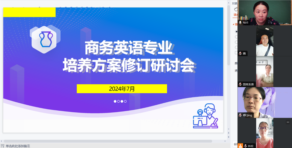 2024年专业培养方案修订研讨会于7月16日在腾讯会议顺利召开。本次参会人员有:商务英语专业主任吴瑗瑗,教研室教师林校、朱卿、葛慧静;福州尚飞制衣有限公司总经理陈耿、福州安王贸易有限公司总经理王巧榕、福建省赛欧金桦商贸有限公司总经理黄力亮、福州润家家居有限公司总经理江如青。