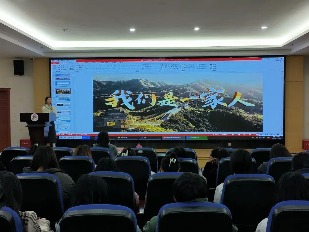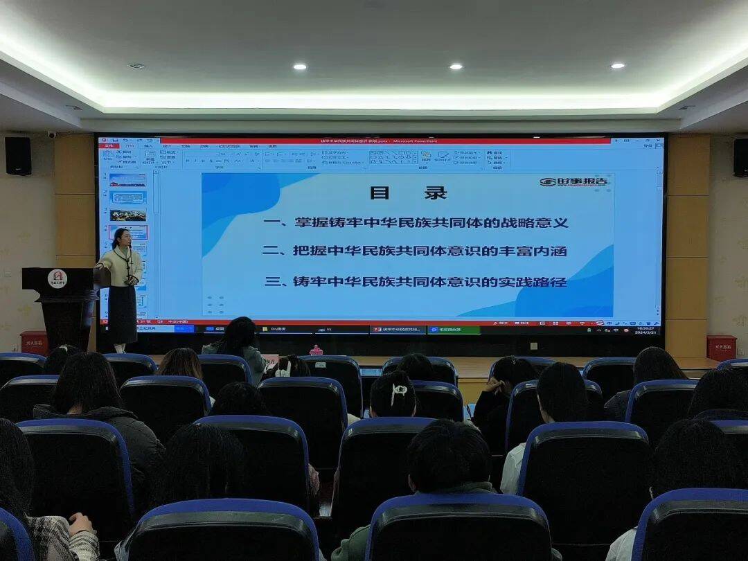 为贯彻落实习近平总书记关于推进民族团结和改进民族工作的重要指示精神,促进中华民族共同体意识,国际商务管理系团总支于2024年3月21日在余宝笙报告厅开展“铸牢中华民族共同体意识”主题团课活动,团课由团总支书记方佳慧主讲,辅导员汤秋月老师、青马培训班学员、大学生骨干参加此次团课。