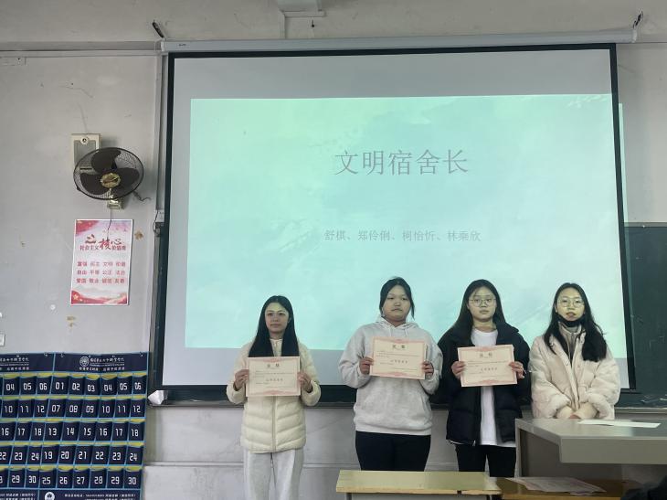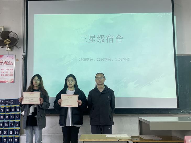 五星级宿舍: 2306宿舍、四星级宿舍:2504宿舍、1608宿舍、三星级宿舍:2309宿舍、2210宿舍、1409宿舍、文明宿舍: 2304宿舍、1101宿舍、2305宿舍、2308宿舍、文明舍长: 舒棋、郑伶俐、柯怡忻、林乘欣。