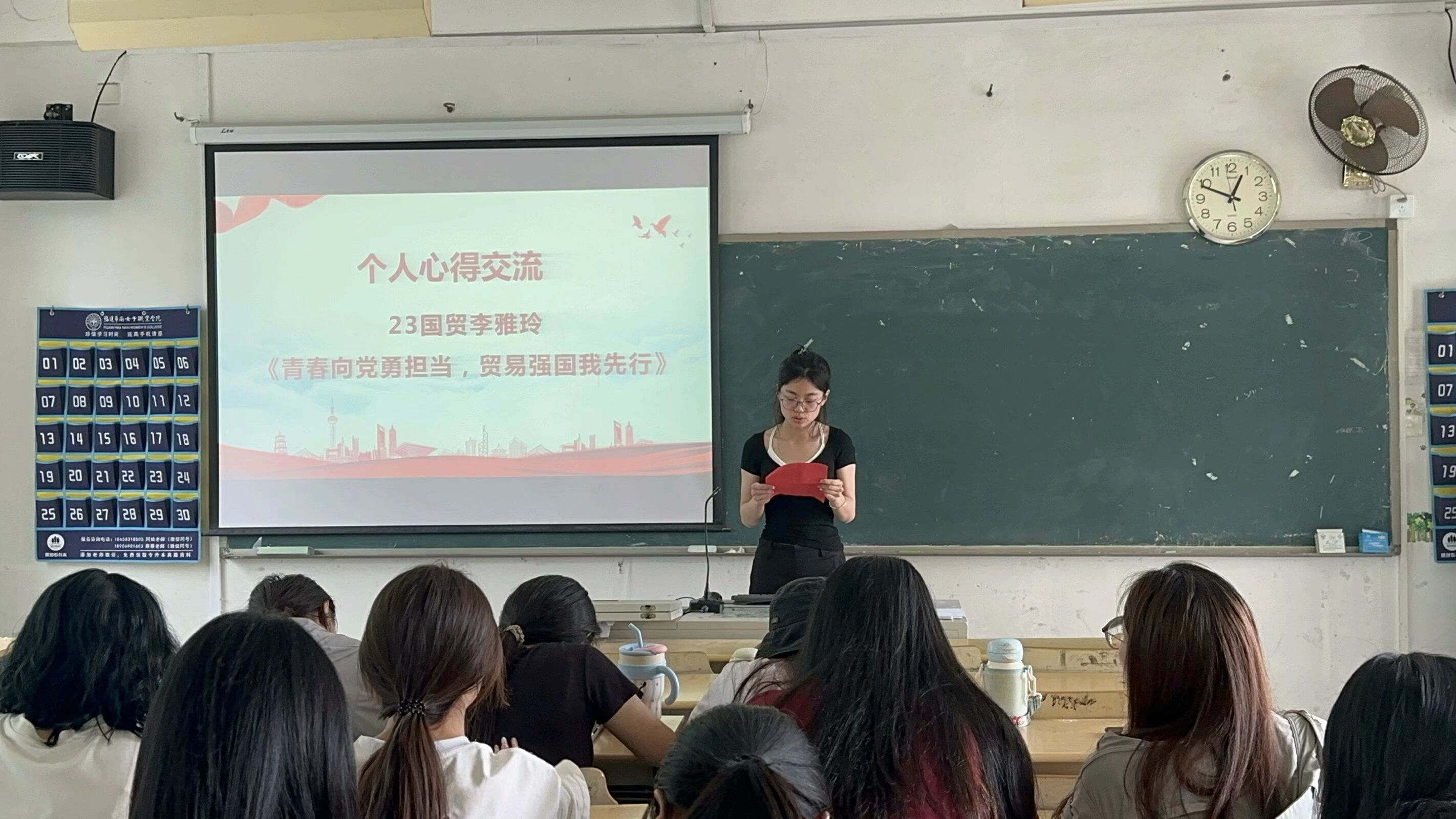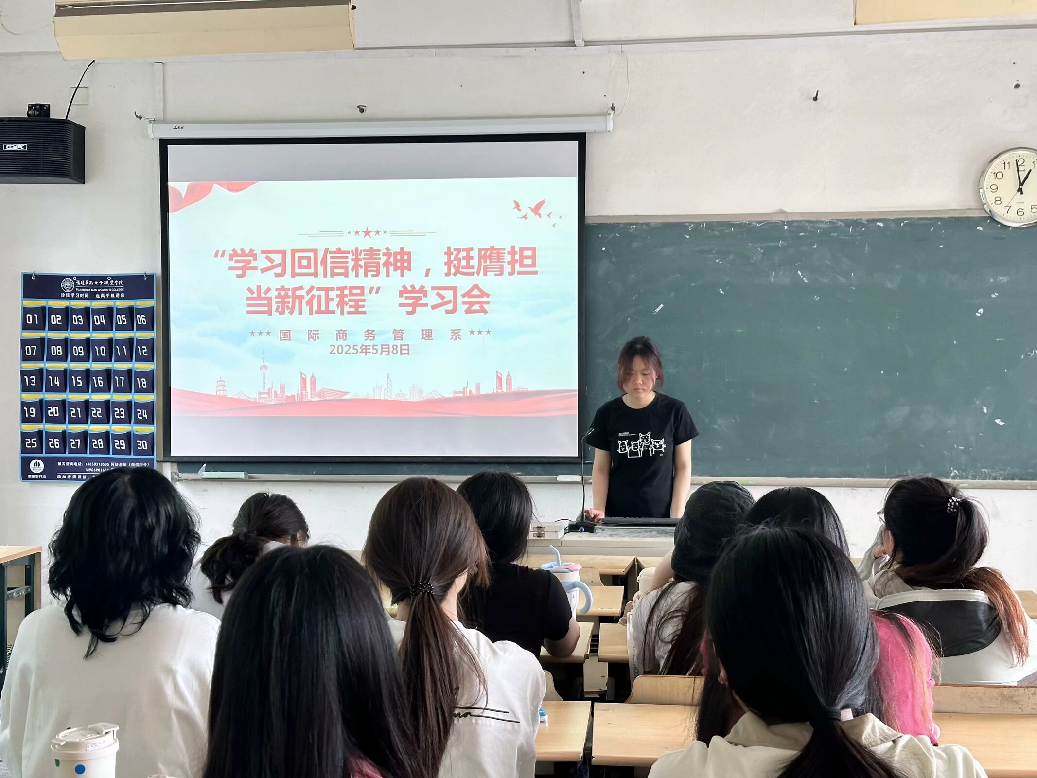 为深入学习贯彻习近平总书记2025年五四青年节给新疆谢依特小学戍边支教志愿者的回信精神,以及《求是》杂志5月1日发表的《激励新时代青年在中国式现代化建设中挺膺担当》重要文章,国际商务管理系团总支迅速行动,通过专题学习会、基层团支部学习等形式,推动理论学习与实践育人深度融合,引导青年学子将个人理想融入国家战略,以实际行动书写青春答卷。