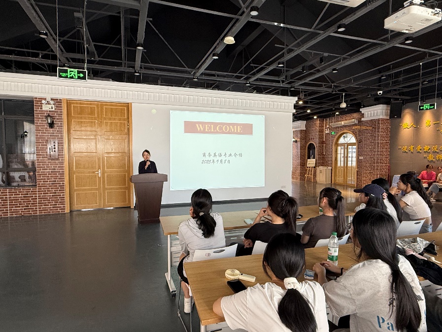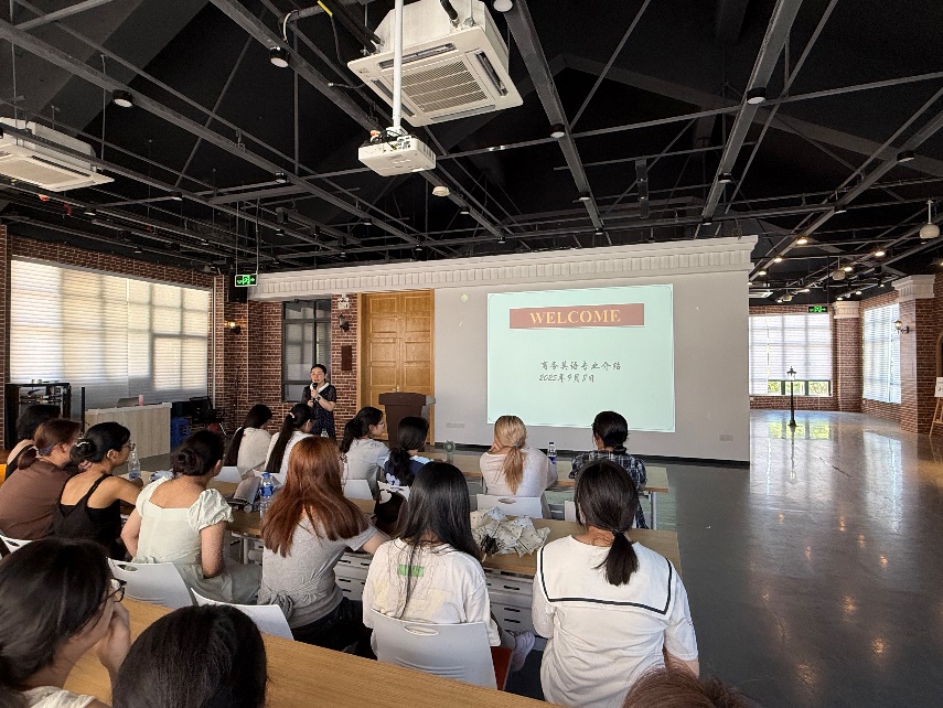 随后,商务英语专业主任吴瑗瑗围绕教学计划与学习特点展开系统介绍,从课程设置、培养目标到学习方法,全面梳理专业学习脉络,帮助新生明确未来方向。她还重点分享了专业近年来的突出成果,展现学子过硬实力;专升本升学率持续保持高位,为学生升学深造提供有力支撑。