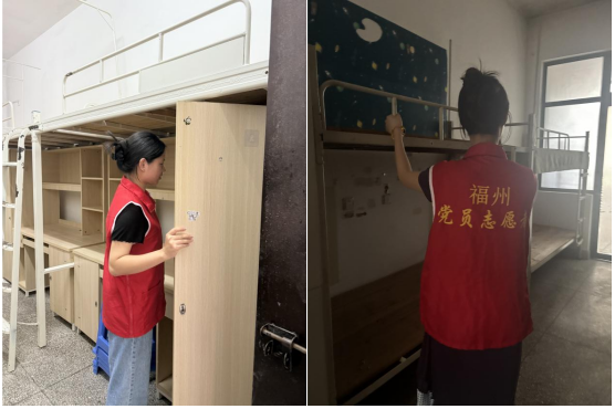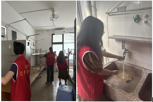 打扫完毕后,学长学姐们又化身 “设施检修员”,逐一对宿舍内的桌椅、床铺栏杆进行检查,轻轻晃动桌椅查看是否稳固,细致触摸床铺栏杆确认有无松动;同时逐一测试水电开关,检查水龙头是否漏水、灯具是否正常照明,确保每一项设施都能安全使用。发现个别宿舍的桌椅螺丝松动,学长们当场找来工具拧紧;遇到水龙头轻微滴水的情况,立即在党员教师的协调下联系后勤人员到场维修,用 “提前一步” 的用心,让新生拎包入住无顾虑。