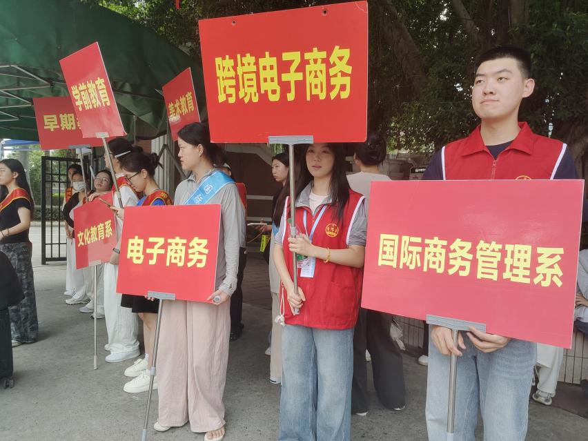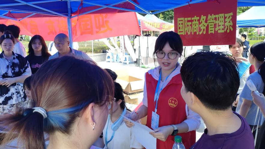 “同学你好!是国际商务管理系的新生吗?这边请!” 开学报到当天,校门口最显眼的位置,国商系的学长学姐们举着醒目的 “国际商务管理系新 ” 牌子,在支部党员教师的指导下早早等候在那里。红色的牌子在人群中格外亮眼,学长学姐们热情的笑容,更成为新生寻找 “组织” 的最佳标识。