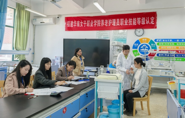 2025年3月9日,在教学楼4-102、实训楼1-207顺利开展了养老护理员高级职业技能等级认定考试,共计45名护理专业的在校生参加了本次考试。顺利完成了”为手臂红肿的老年人进行湿热敷、协助不能自理老年人口服用药、指导偏瘫老年人进行穿脱开襟上衣训练、对睡眠障碍老年人进行的健康教育措施“等项目的考核。