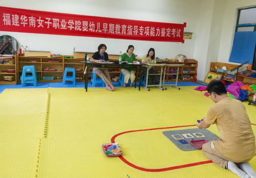 此次考试聚焦婴幼儿早期教育实践能力,设置了多项针对性考核项目。在对30 - 36 月龄幼儿的图形配对训练教学考核中,考生需展现出清晰的教学思路与引导技巧,帮助幼儿完成图形认知与配对;运用穿线板训练幼儿手眼协调能力的考核,着重检验考生对幼儿动作发展规律的把握及教学方法的运用;考生运用建构积木教具对幼儿进行空间及创造力训练的考核,体现了对幼儿空间思维与创新能力培养的教学实践;而考生运用早教道具 “彩虹伞” 进行婴幼儿亲子游戏教学的考核,则凸显了亲子互动在早期教育中的重要性,考生需设计有趣且富有教育意义的游戏环节,促进婴幼儿与家长的互动交流。