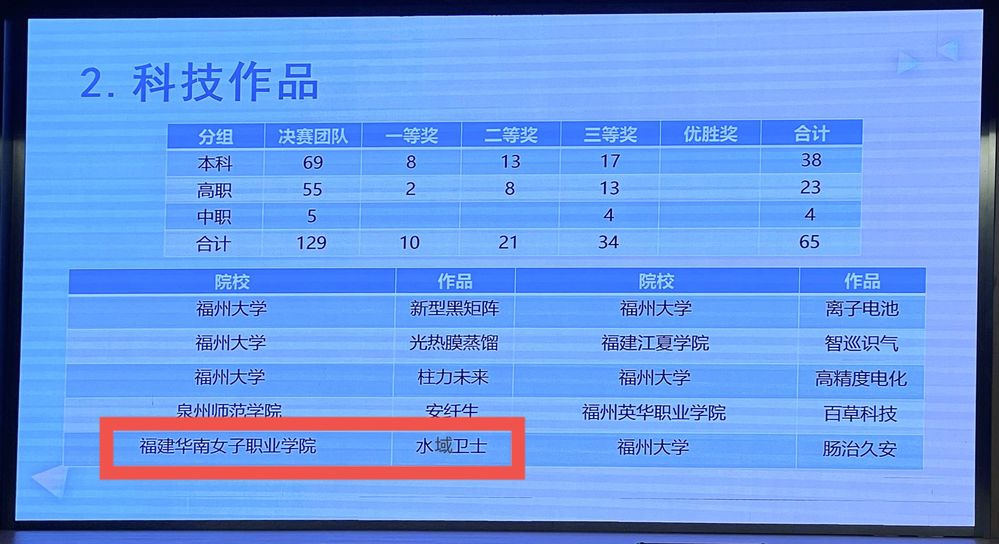 2023年11月10由福建省教育厅、福建省人力资源和社会保障厅、福建省互联网信息办公室、平潭综合实验区管委会联合主办的第十届海峡两岸暨港澳大学生职业技能大赛及创新创业成果展在福州英华职业学隆重举行。经过院内初赛及复赛评审,健康服务系选送的“水域卫士-数字化水域清洁治理解决方案助力水产绿色发展”项目荣获成果展一等奖。