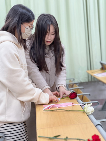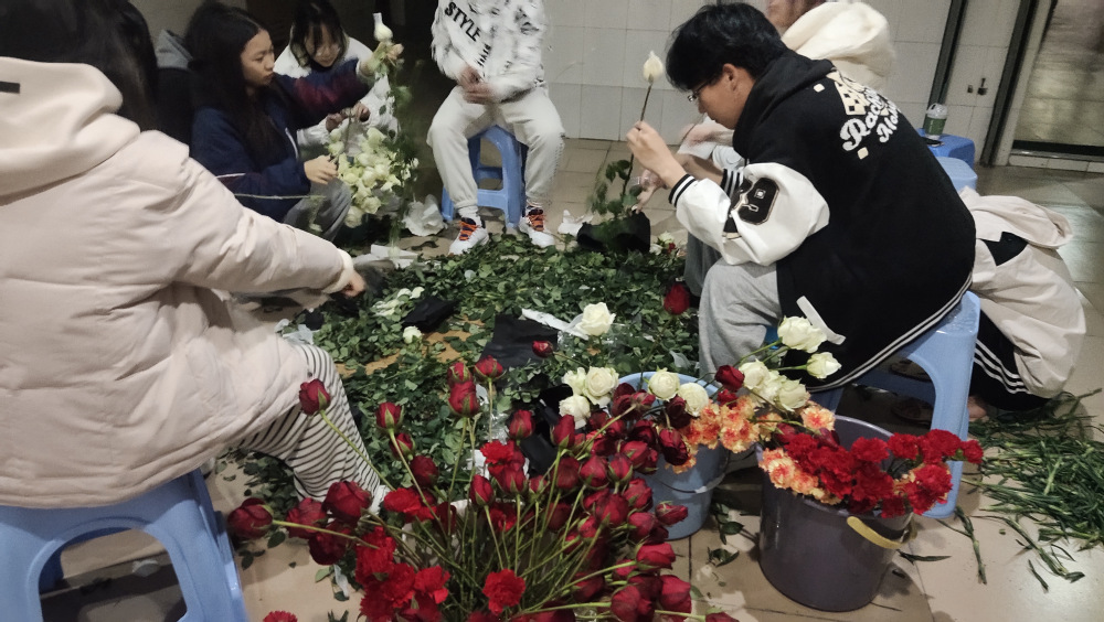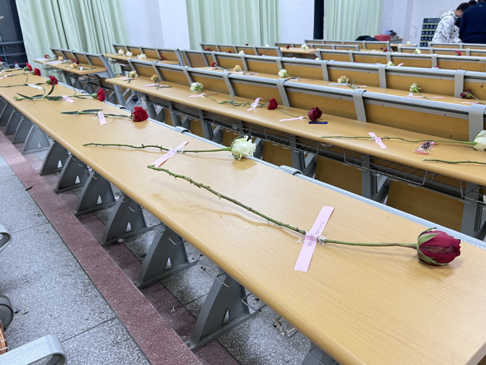 全体学生干部在教室为每支鲜花贴上专属祝福语,为同学们送去真挚的祝福,祝福全体女生永远自信坦荡,散发万丈光芒!