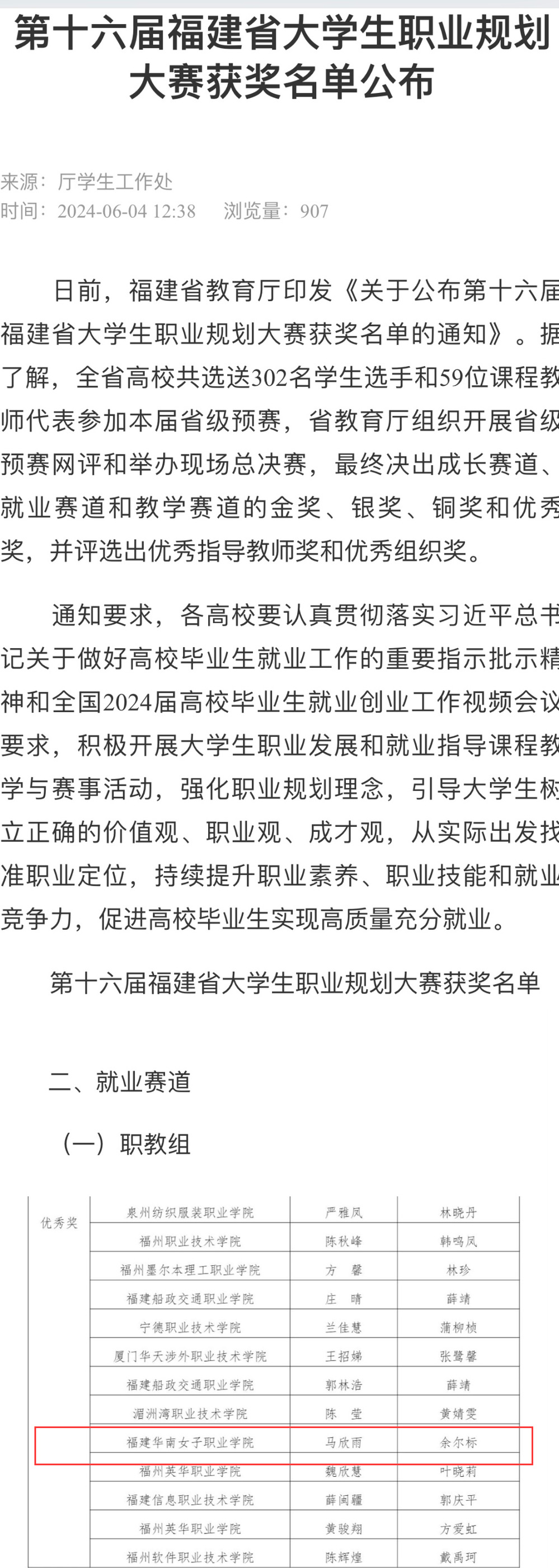 日前,福建省教育厅印发《第十六届福建省大学生职业规划大赛获奖名单》,我系2021级护理专业马欣雨荣获高教组优秀奖。