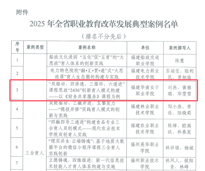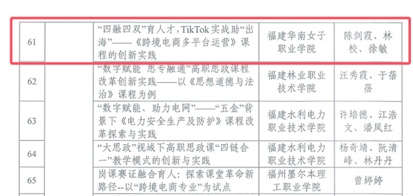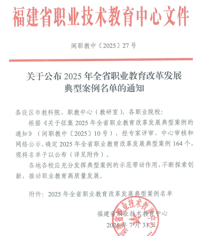 近日,福建省职业技术教育中心公布了2025年职业教育改革发展典型案例名单(闽职教中〔2025〕27号),我校《“双驱动,四渗透,三循环,六递进”课程思政“2436”创新育人模式构建——以〈财务共享服务›课程为例》《“四融四双”育人才,TikTok实战助“出海”——〈跨境电商多平台运营〉课程的创新实践》两个教学改革案例,分别入选“三全育人”类、“课程改革”类典型案例。