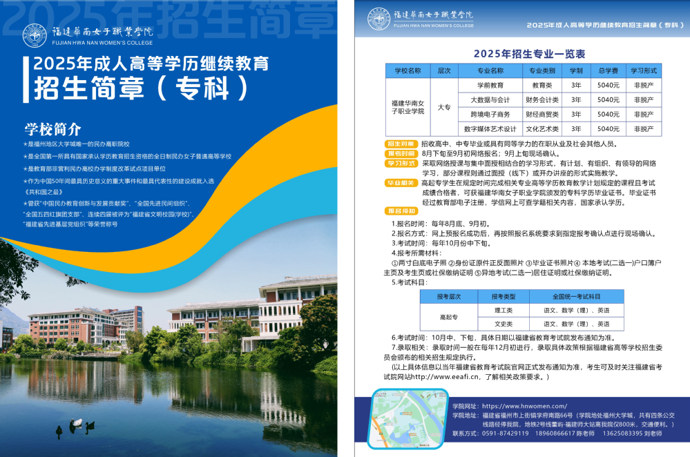 福建华南女子职业学院2025年成人高等学历继续教育招生简章(专科)