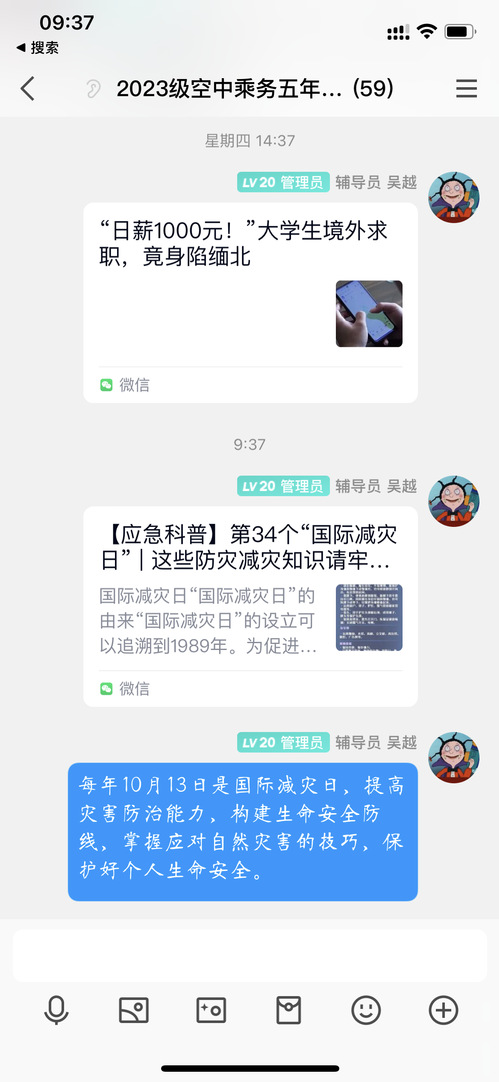 主题班会外,我系辅导员们借助系部群、专业群以及班群等宣传防灾减灾知识,丰富知识资源,推动学生自主阅读、自主学习。辅导员卢艺菲通过走访宿舍,向学生宣传宿舍安全知识,包括禁止使用高功率电器、禁止私拉电线等,以及宿舍逃生自救常识、灭火常识等。