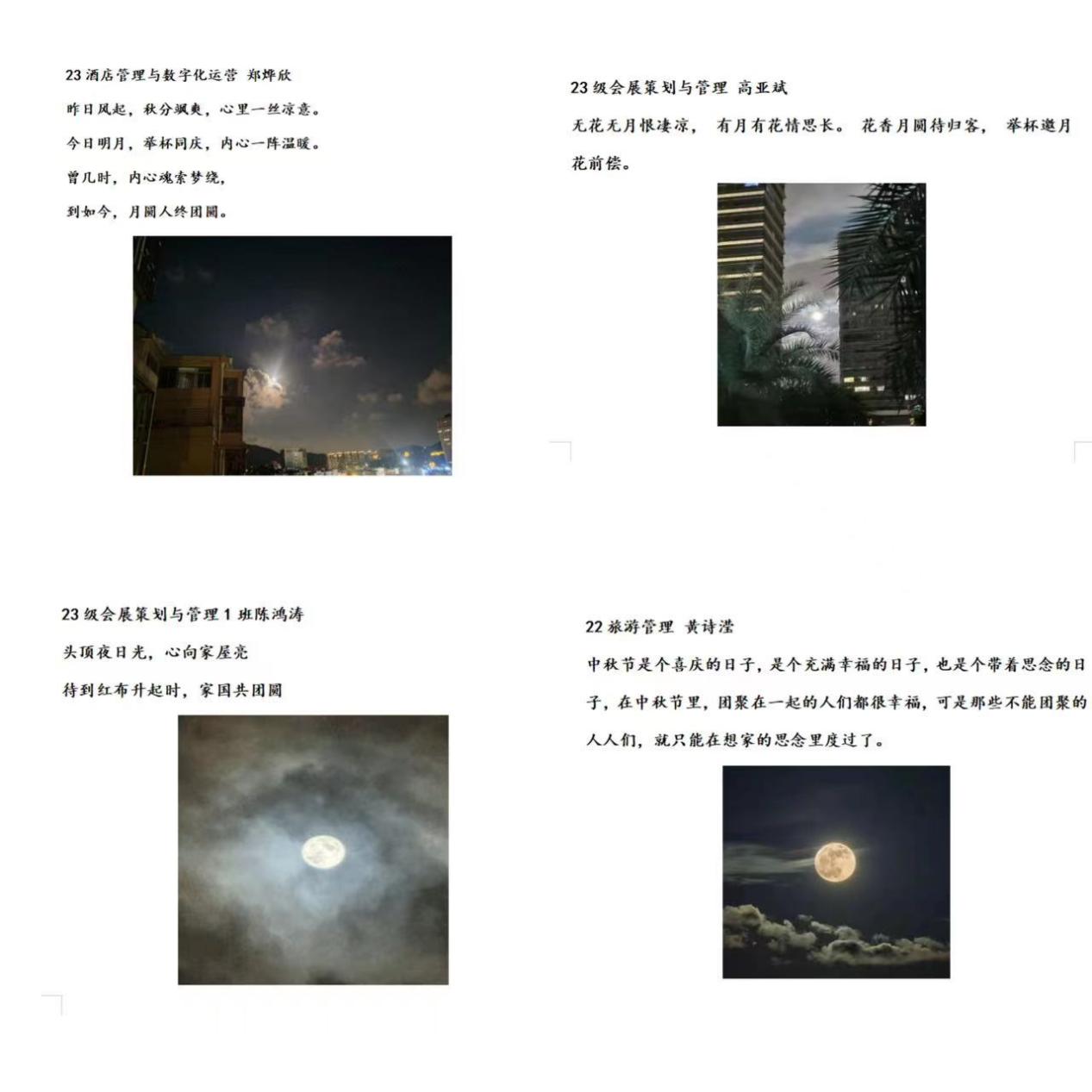本次活动一开启,就得到了旅游服务系同学们积极响应。大家通过团圆饭照片分享在家团聚的美好时刻,以饱满的热情创作小诗来书写团聚的心情。分享同一片天空中的同一个月亮,无论是在他乡望月,还是在故乡赏月,无论是手机还是相机,只要我们抬头望月,那就是我们此刻的联系。