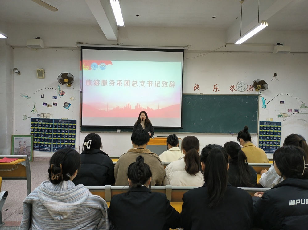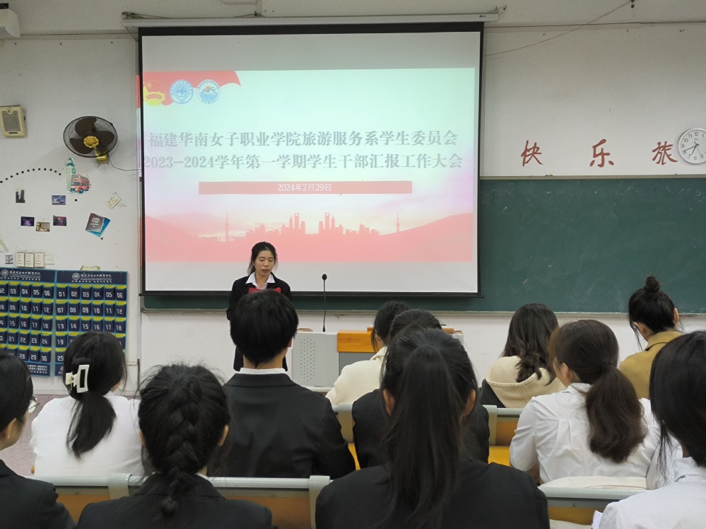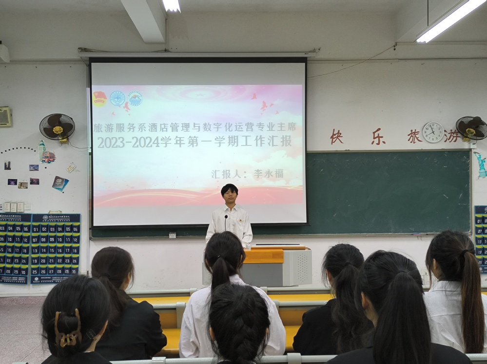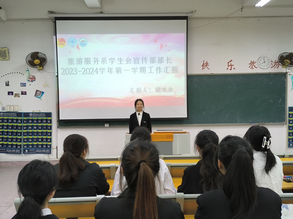 本次活动三项议程。会议第一项议程,各部门学生干部分别从个人基本情况、工作成效与总结以及对未来的展望方面较为详细地汇报了2023-2024年第一学期的工作概况和第二学期的工作计划会议第二项议程,全体师生合唱共青团之歌会议第三项议程,由旅游服务系团总支书记廖哲仪对本次大会进行总结,廖哲仪老师肯定了各学生干部过去半年的工作,希望大家在未来的学习和生活中要继续学习,不断提升自己的能力,争取以更热情与饱满的姿态投入到学生工作当中。