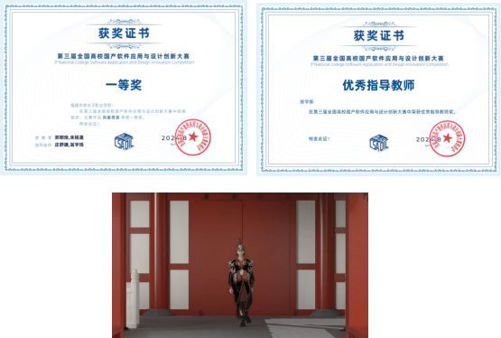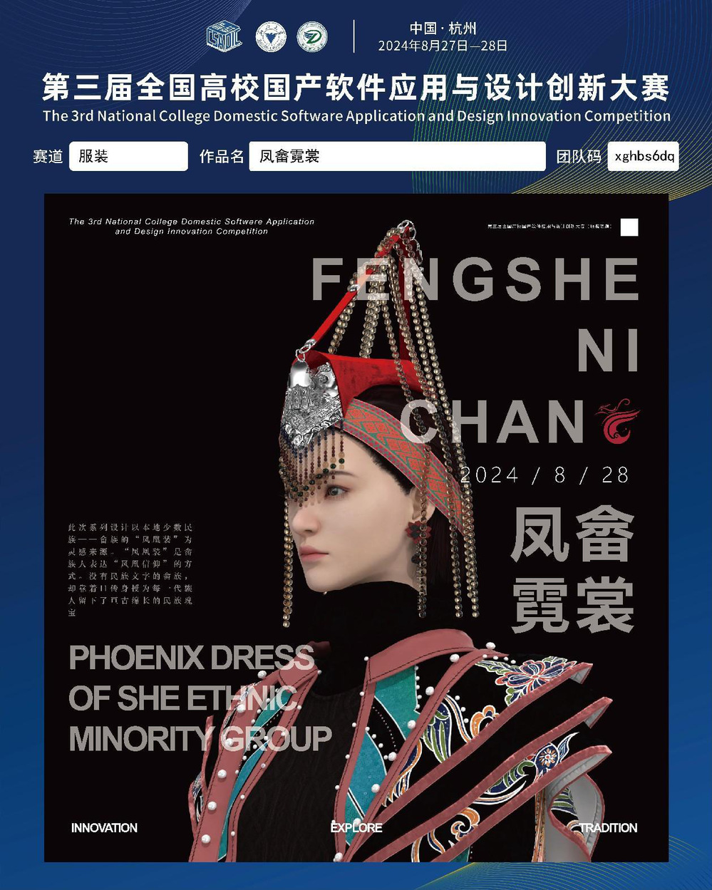 由服装与服饰设计专业学生郑明烩与数字媒体艺术设计专业学生朱铭晟跨专业组队,在服装与服饰设计专业带队老师庄舒婕、翁宇烁的细心指导之下,数字化服装设计作品《凤畲霓裳》在第三届全国高校国产软件应用与设计创新大赛(服装赛道)”中获一等奖