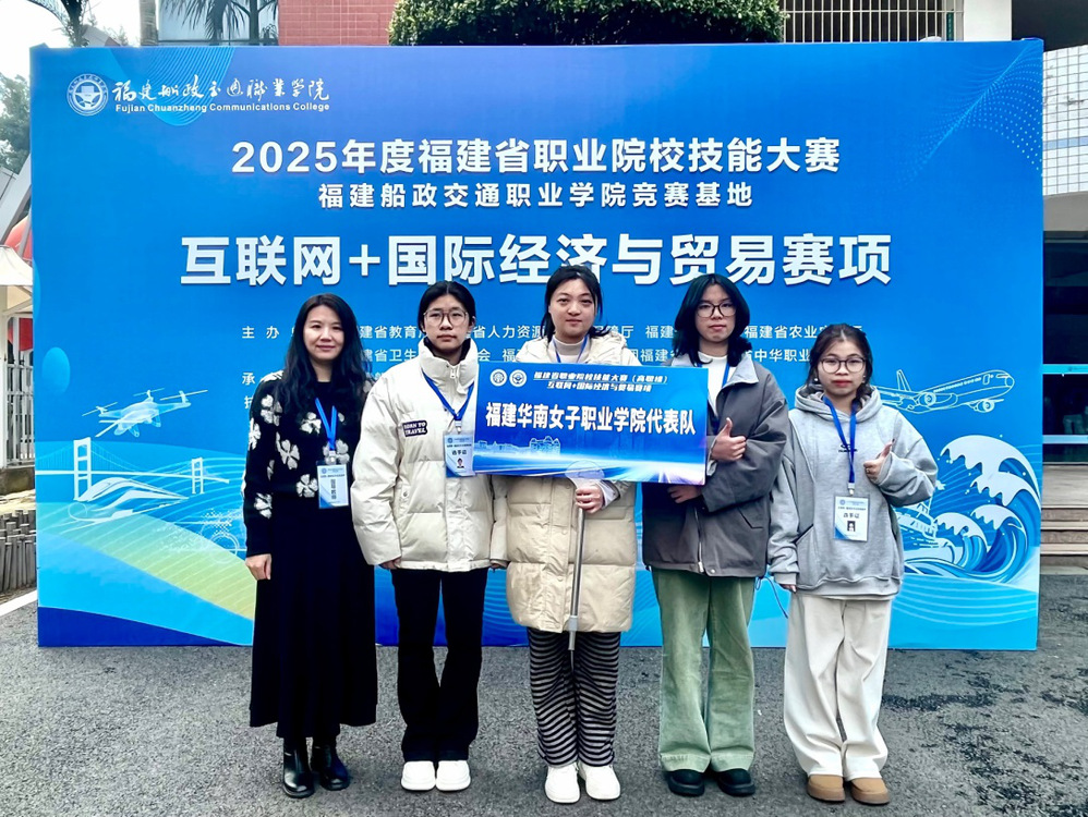 202538-9日,由福建省教育厅主办的2025年福建省职业院校技能大赛“互联网+国际经济与贸易”赛项(高职组),共有26所院校参加此赛项,我校电子商务专业陈剑霞老师指导的2023国贸吴万玲、乐颖姿,2023电商庄滢、林洁同学组成4人团队荣获三等奖。