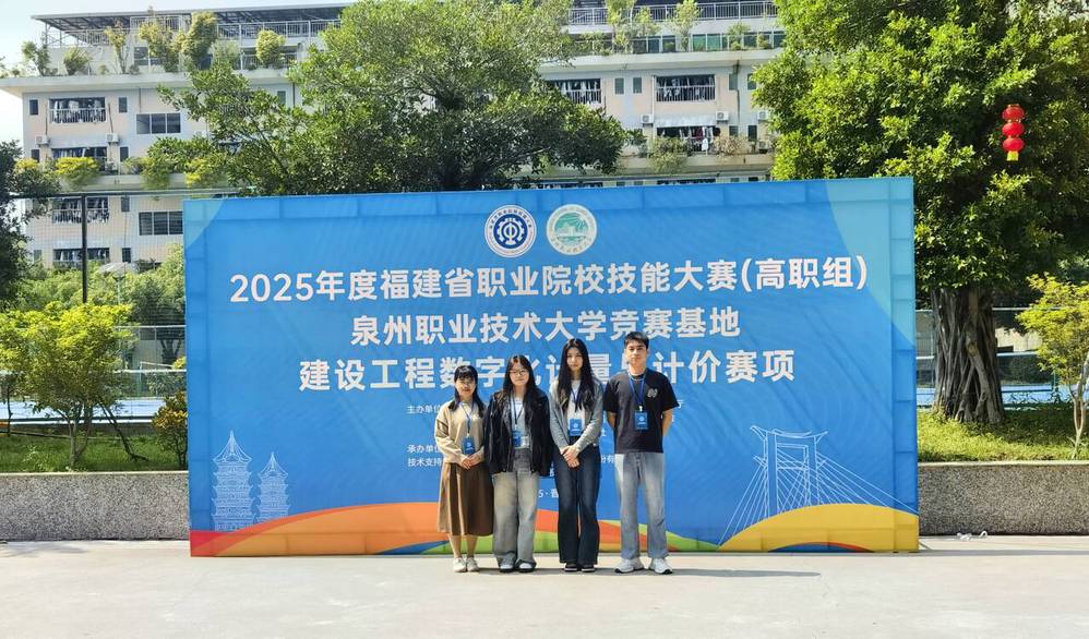 2025年4月8日,由福建省教育厅主办,泉州职业技术大学承办的福建省职业院校技能大赛建设工程数字化计量与计价赛项(高职组)圆满落幕。参加此赛项的共有24所院校,我校工程造价专业李雪英老师指导的2023级学生刘虹汝、何瑞龙、李雅芝组成团队,荣获三等奖。