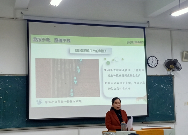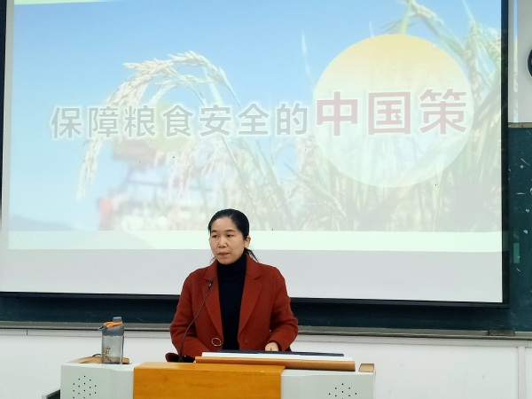 课上,吴岚葭副书记以“保障粮食安全的中国策”为主题,为2022级艺术设计专业、空中乘务专业学生授课。她回顾了习近平总书记针对“粮食安全”内容的讲话精神,言简易深地阐述了“我国粮食安全持续向好”的重要原因,重点针对“国家粮食安全策略”、“我国农情”等几方面作深入剖析,帮助学生认清“粮食安全”这一事关人类发展重大问题。课后,同学们纷纷表示这样的课堂有深度、有温度、接地气,充分认识我国走中国特色粮食安全之路的具体优势。