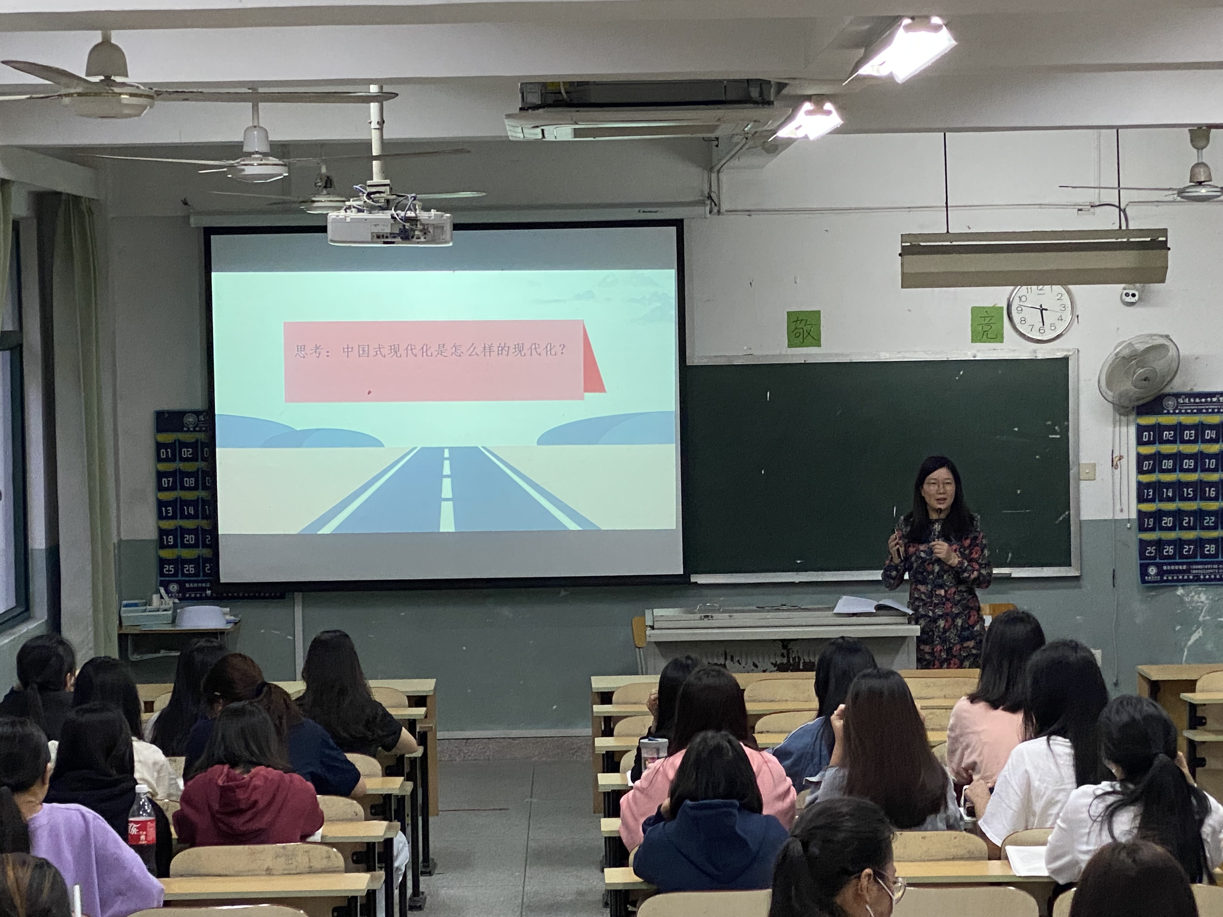 张秋蘋副院长讲授的专题是“走好中国式现代化之路”。课上,她围绕“接续奋斗,追求千年梦想”、“立足国情,开辟全新道路”以及“凝心聚力,推进复兴伟业”三个方面为同学们深入浅出讲授了中国式现代化与实现中华民族伟大复兴之间重要关系,并阐明中国式现代化是中国共产党领导的社会主义现代化,既有各国现代化的共同特征,更有基于自己国情的中国特色。课堂上,她时不时与同学们互动,为同学们解答问题,课堂上自始至终洋溢着欢乐的气氛。