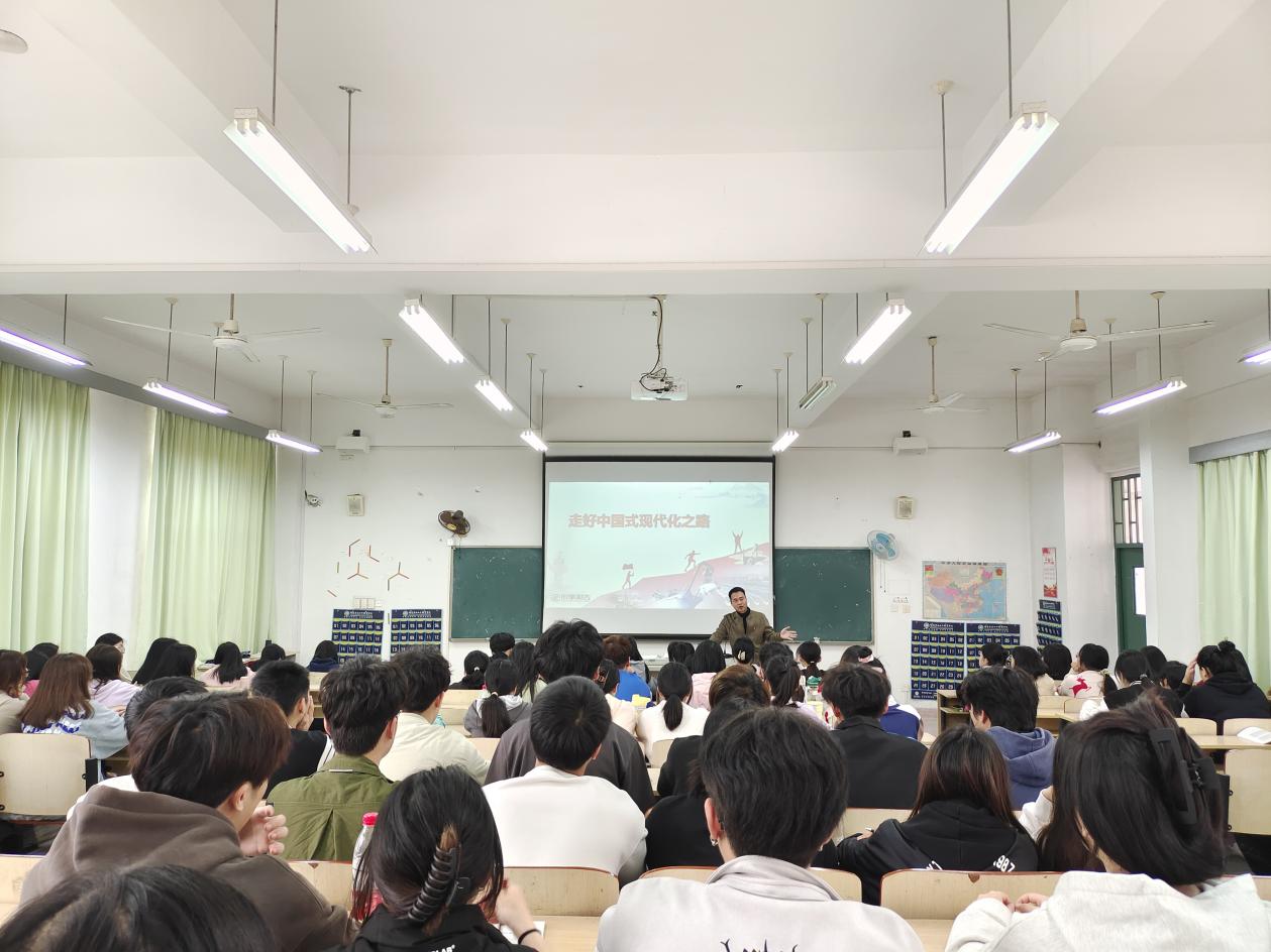 为深入学习贯彻习近平新时代中国特色社会主义思想,贯彻落实党的二十大精神,引导青年学生踔厉奋发,勇毅前行,3月20日,我院党委书记李廷旺以“走好中国式现代化之路”为主题,为旅游服务系2022级会展策划与管理专业1班和2班的同学们讲授形势与政策课。