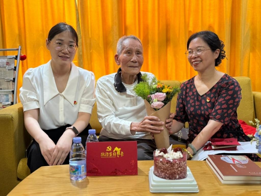 支部书记陈宏华首先为陈世明同志颁发党员政治生日卡,“1946年2月1日,您光荣加入中国共产党,今年党龄78,党组织向你表示衷心祝福,……”,在场的人员为这位白发苍苍而精神矍铄的百岁老党员送上热烈的掌声,敬献鲜花和政治生日蛋糕。大家围坐在他身边,听他讲述入党的初心故事。