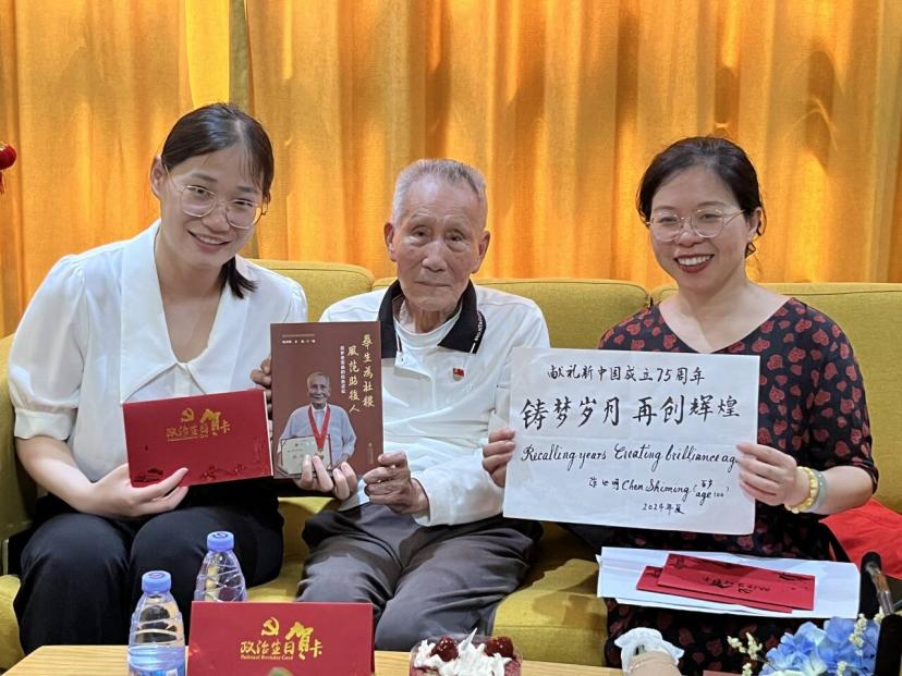 陈世明同志回顾自己平凡但不凡的百岁人生。他是闽浙赣区(省)委城市工作部龙山会议唯一的健在者,担任闽永尤南沙五县县委委员等职务,为革命工作赴汤蹈火。曾多次被国民党反动派迫害,他坚定理想、忠于信仰、严守党的秘密,表现出共产党员的崇高信念和钢铁意志。社会主义革命建设时期他为了国家和社会需要,刻苦研究,成为建国初期著名的制糖专家。离休后到民办学校贡献自己的力量,20多年前曾到华南女院为入党积极分子开设“迎七一坚定理想信念”专题讲座。而今住进养老院,还在为青年一代上党课,整理革命故事。作为中美友谊的见证者,近日他受邀参加2024“鼓岭缘”中美青年交流周“鼓岭故事”激情分享与外国老师的师生情。