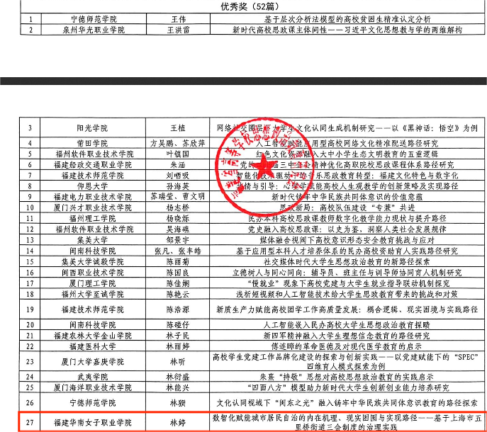 近日,福建省高等学校思想政治教育研究会公布《关于表彰福建省高等学校思想政治教育研究会2024年优秀论文的通知》(闽高思研[2024]7号)。经专家匿名评审,我校马克思主义学院林婷老师的论文《数智化赋能城市居民自治的内在机理、现实困囿与实现路径——基于上海市五里桥街道“三会”制度的治理实践》荣获优秀奖。