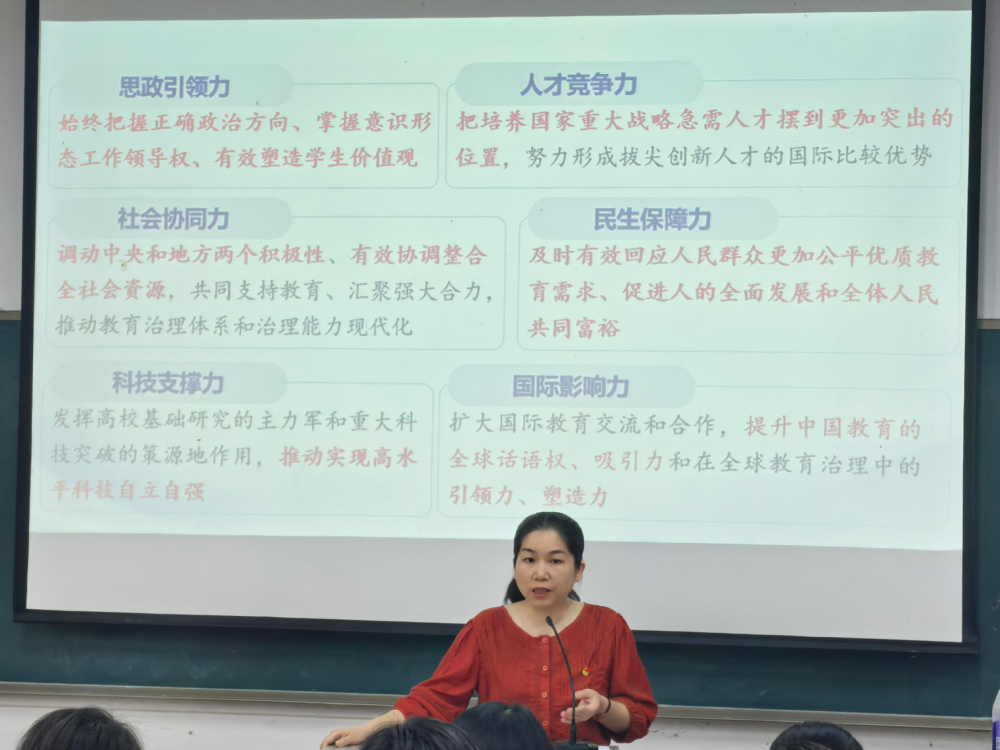 6月9日,我校党委副书记吴岚葭走进思政课堂为2024级国际经济与贸易专业学生讲授“从教育大国迈向教育强国”专题,系统阐释教育强国建设的历史逻辑与实践路径,引导青年学子树立与国家发展同频共振的责任意识。