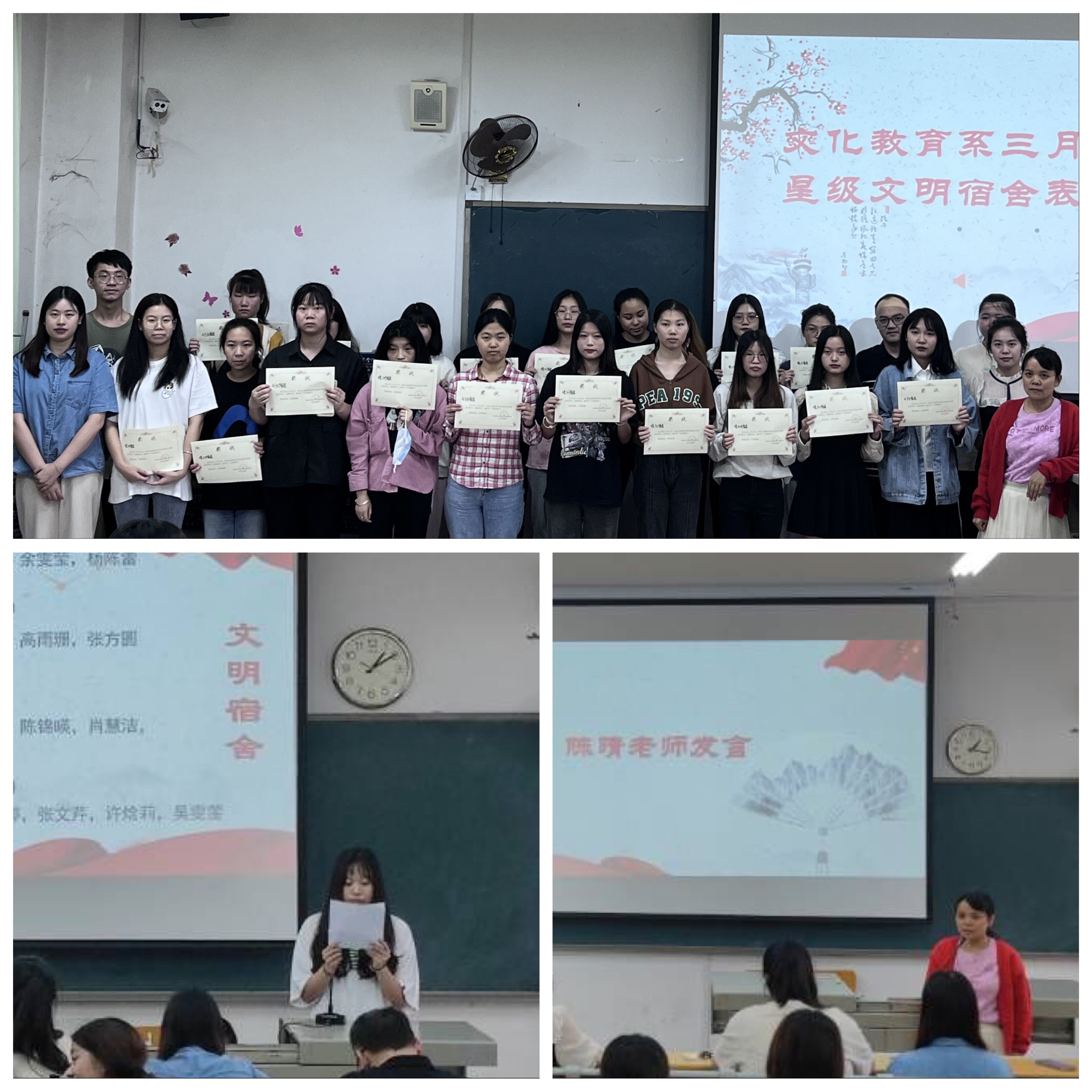 2022年6月9日中午,文化教育系3、4月星级文明宿舍表彰大会在福万楼3202教室举行,文化教育系党总支书记陈晴老师、全系辅导员老师、系督查部部员、各宿舍长代表参加大会。